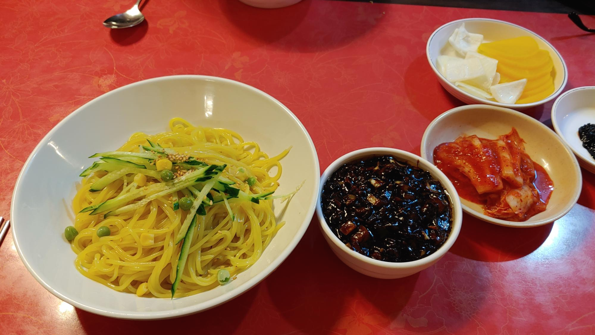 테이블의 회전율이 좋아 그런지 특이하게도 자리마다 양파, 단무지, 볶은 춘장 그리고 김치가 미리 준비되어 있다.