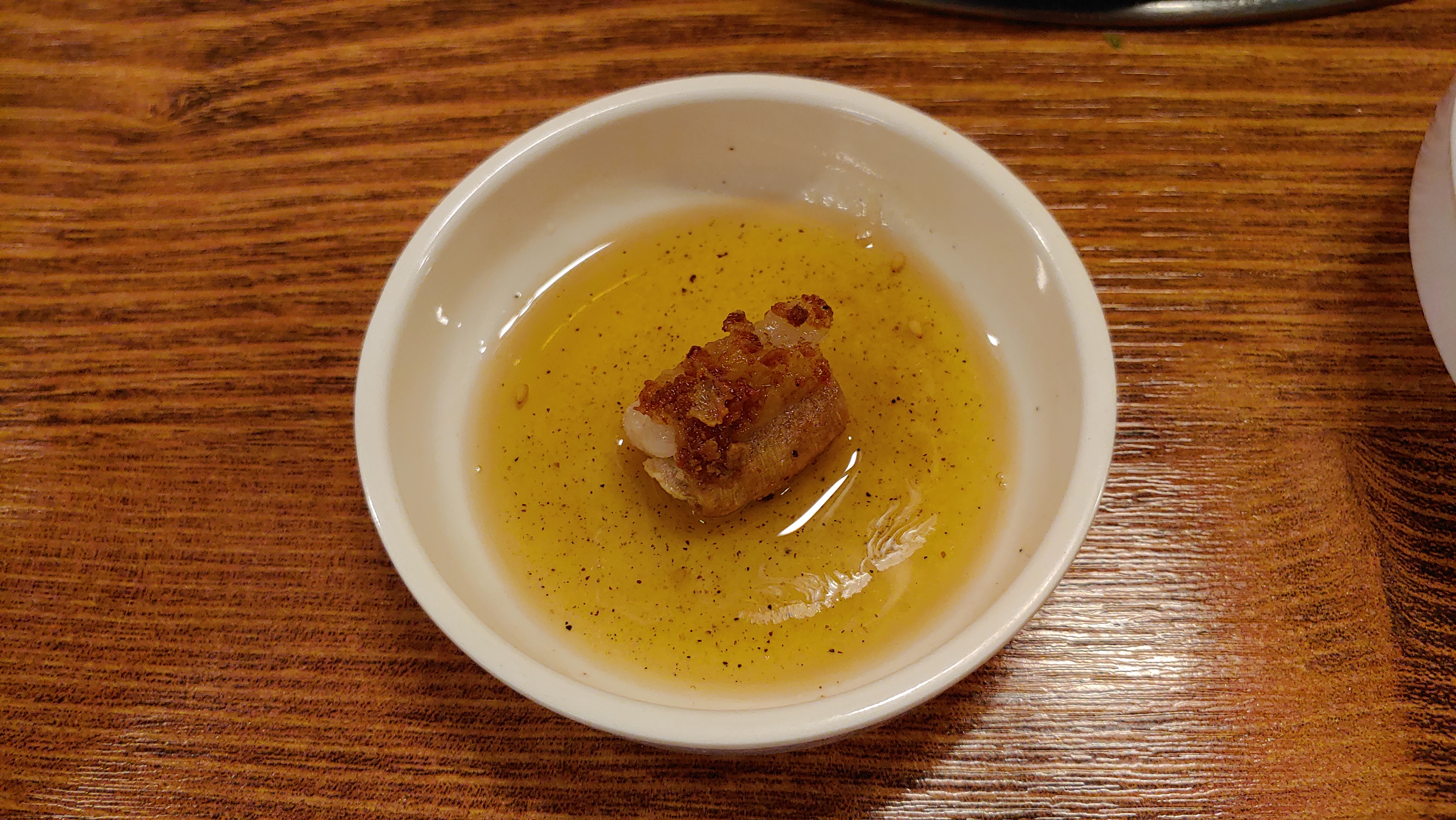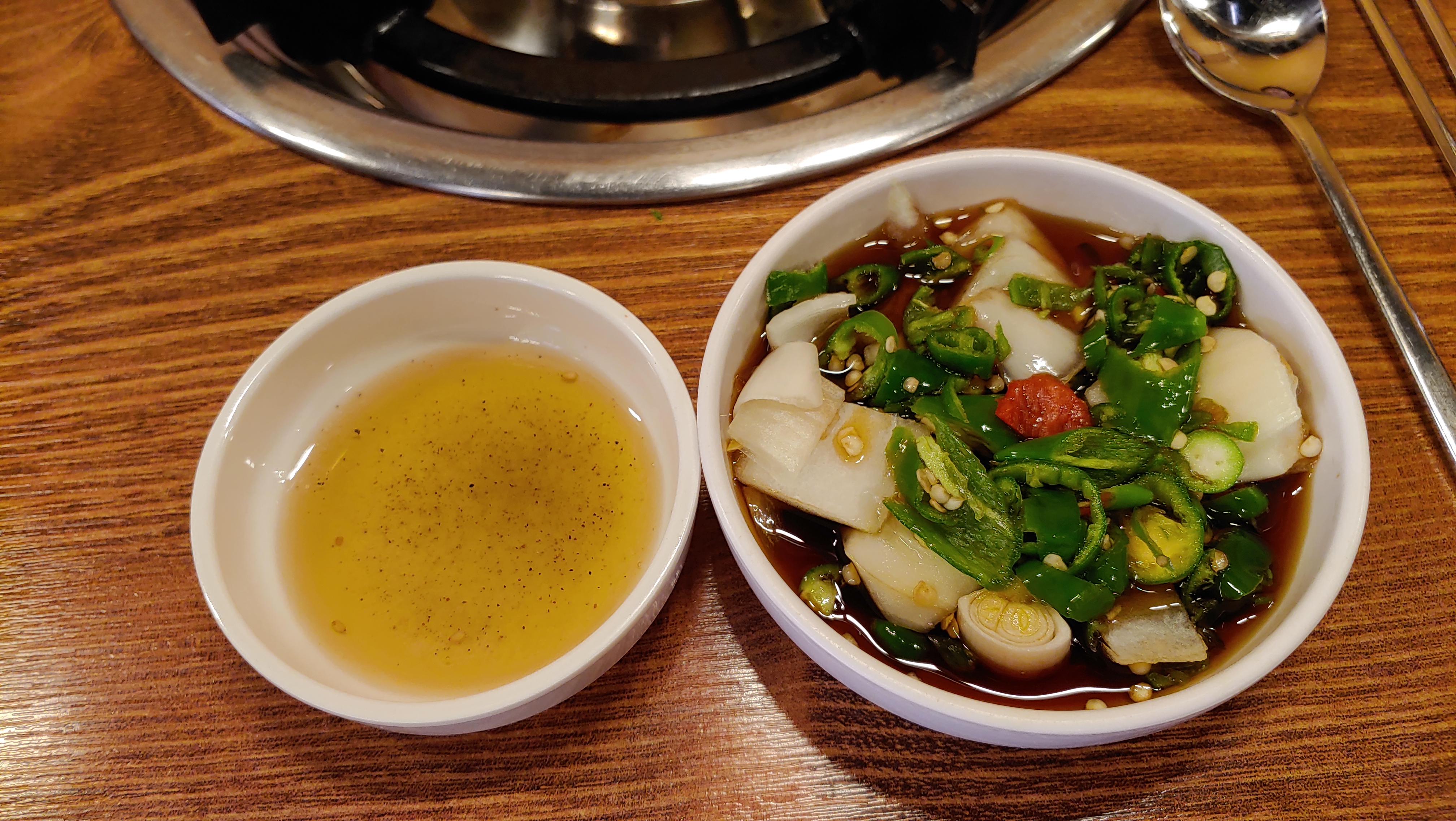 기름장이야 특별할 게 없지만 청양고추와 양파, 파 가 들어간 간장 베이스의 소스는 곱창의 느끼한 기름 맛을 잘 잡아주고 입안에 매콤한 기운을 불어넣어주어 곱창을 끝까지 질리지 않고 먹게 해주는 페이스메이커 역할을 해준다.