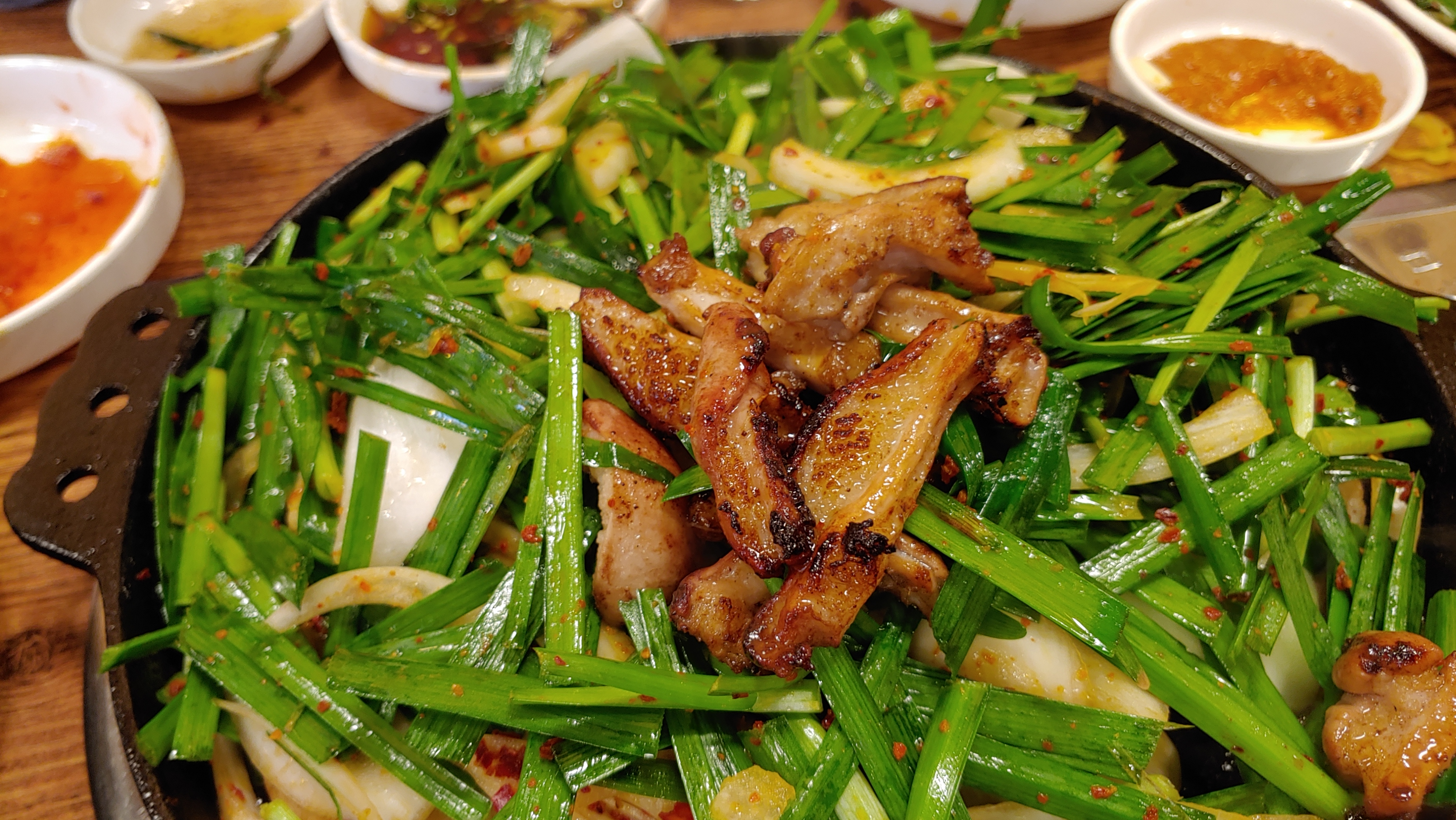 수북한 부추 속에 소곱창과 막창, 양파가 수줍게 숨어있고, 바로 먹어도 될 것 같은 때깔 좋은 염통이 모여있는 모듬곱창은 골라먹는 재미도 느낄 수 있을 정도로 여러 가지 종류의 내장이 들어 있다.