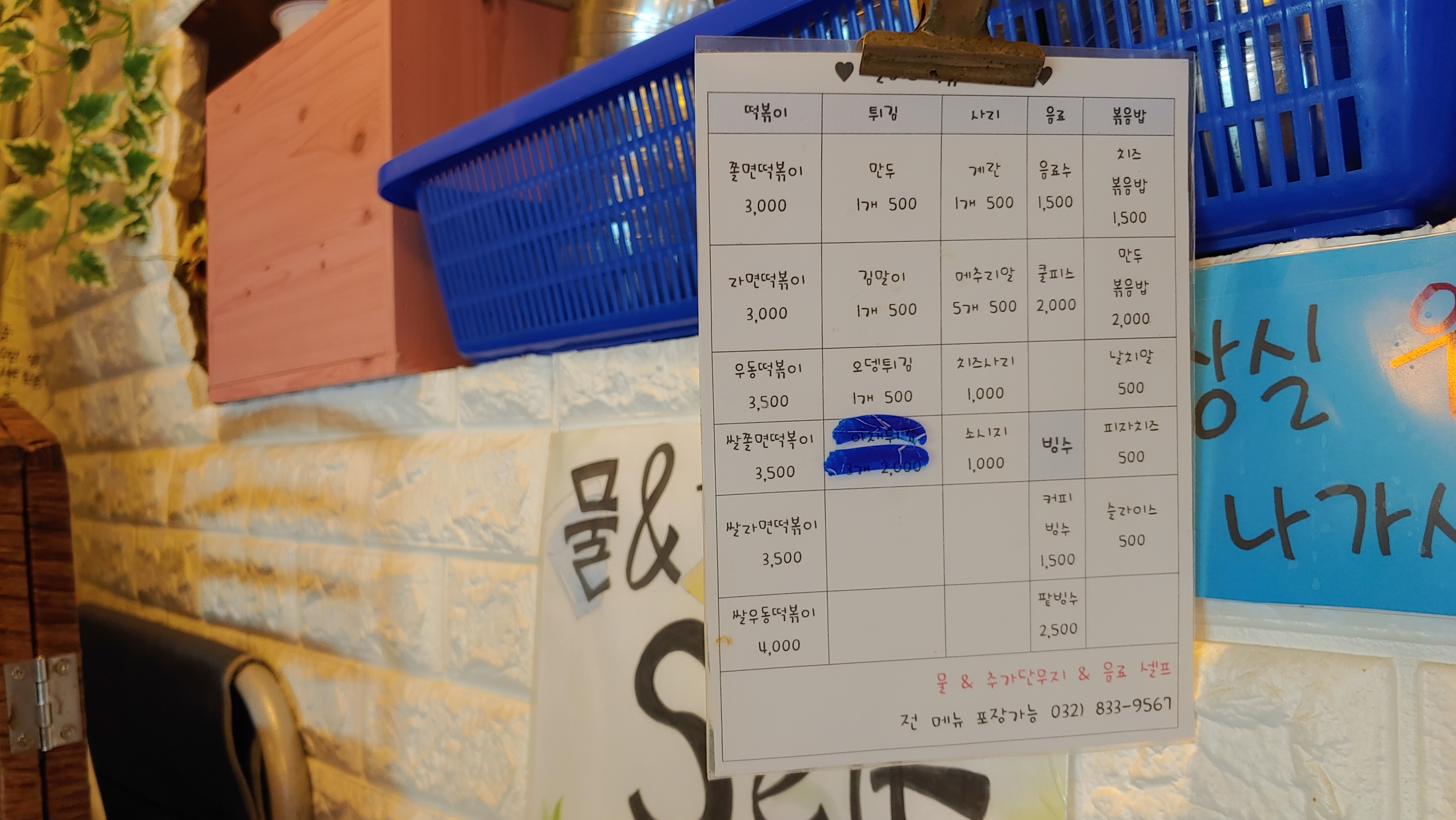 떡볶이는 1인분에 3천원, 떡은 기본 밀떡으로 나오지만 쌀떡을 원할 경우 500원만 추가하면 된다. 튀김이나, 계란 같은 사리는 낱개 단위로 판매하며 개당 500원 정도이다.