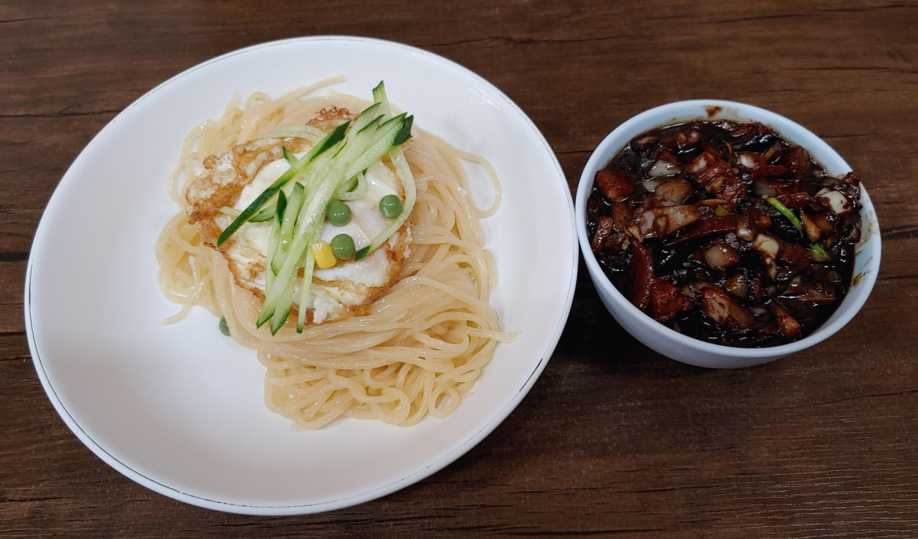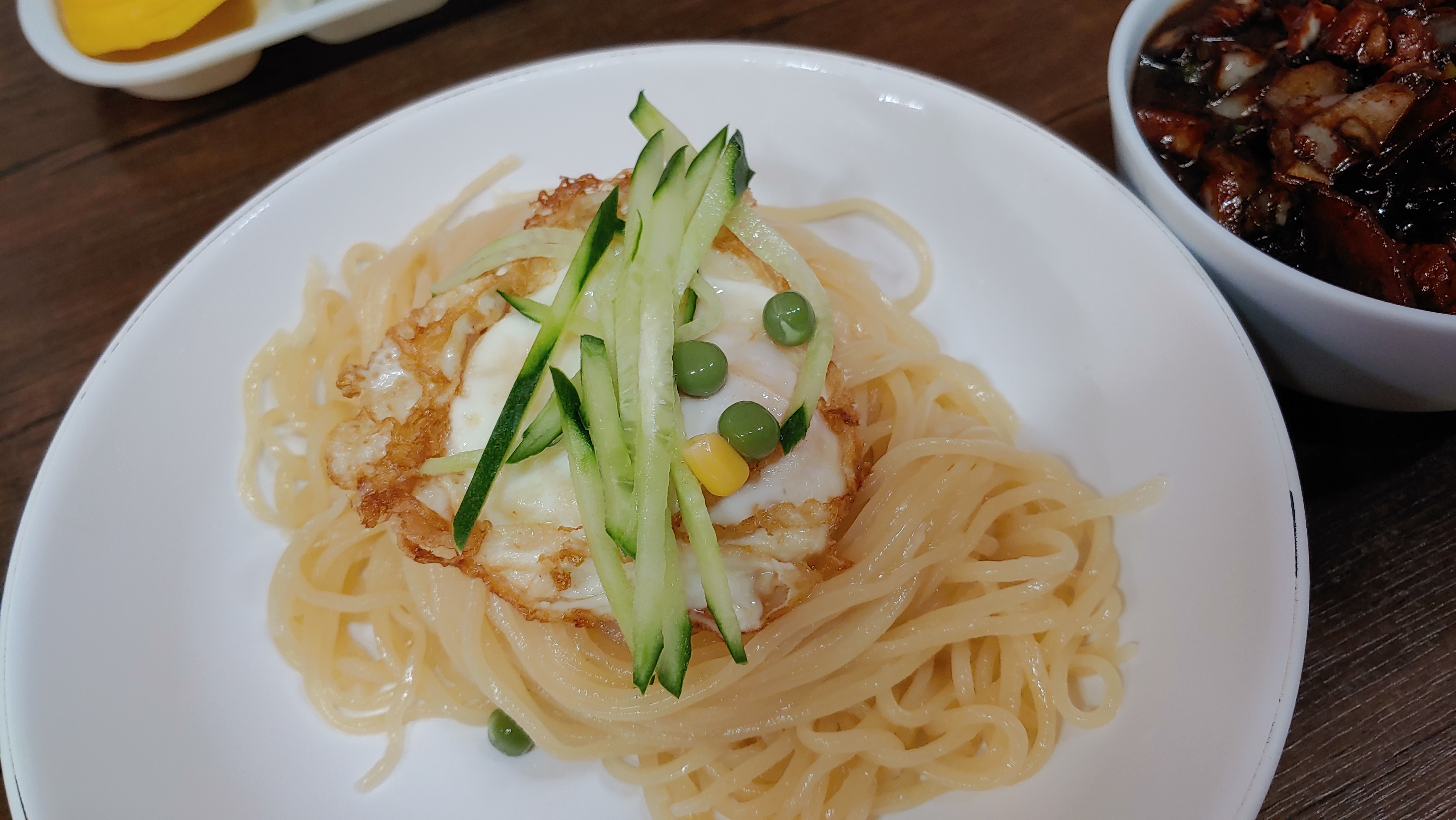 간짜장의 꽃, 기름에 튀기듯 구운 계란 후라이가 올려져 있고 그 위로 오이채, 완두콩이 옹기종기 모여있다. 간짜장 소스는 기름보다는 춘장과 야채에서 나온 채수로 볶아져있는지 기름기 없이 깔끔하다.