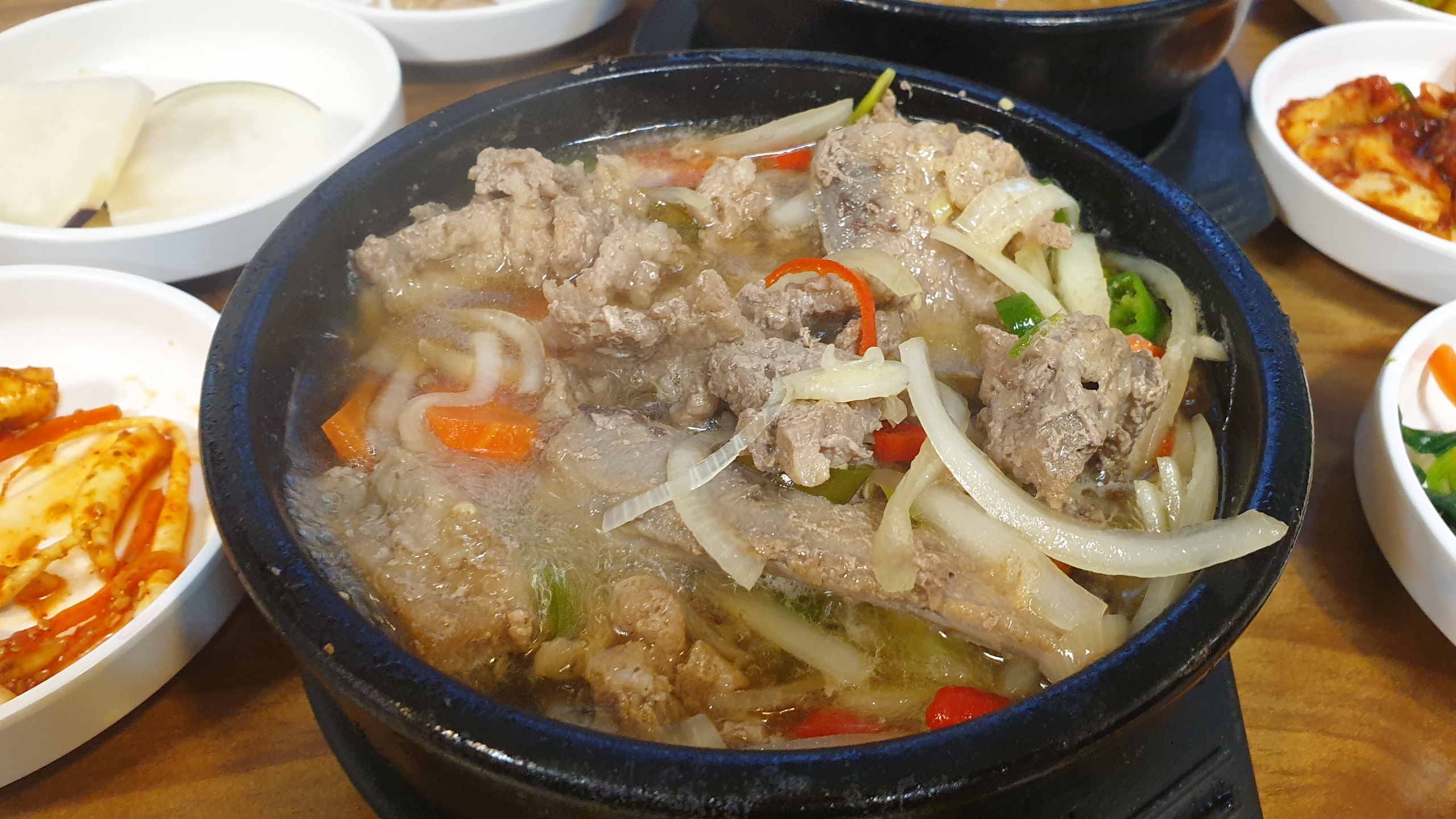 국물 가득한 뚝배기를 바라보며, 첫인사 겸 수줍게 국물을 먼저 떠먹어본다. 오호, 불판에 구워 먹는 단짠단짠의 느낌은 없지만, 돼지갈비찜에 가까운 맛.