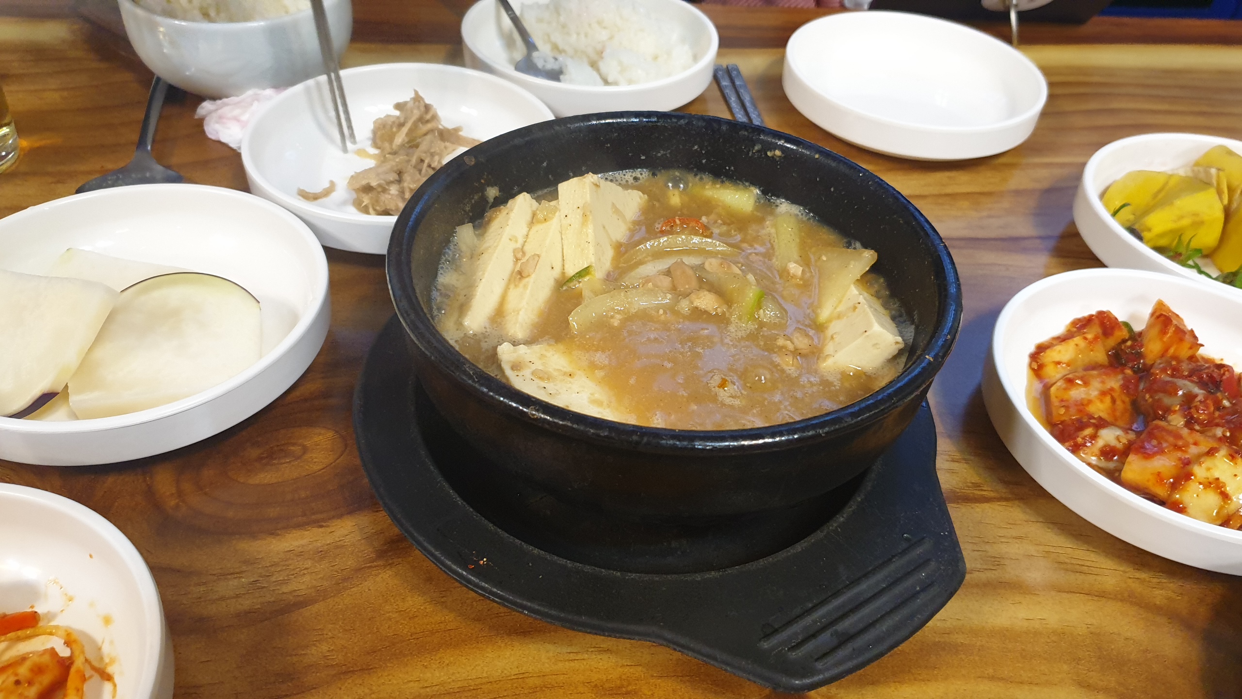 그렇게 정신없이 반찬을 안주삼아 먹다 보니 어느새 청국장이 슬며시 다가온다. 무심하게 툭툭 썰린 두부와 재료들을 받쳐주는, 오리지날 청국장에서 느낄 수 있는 쿰쿰한 향과 진한 국물 맛.