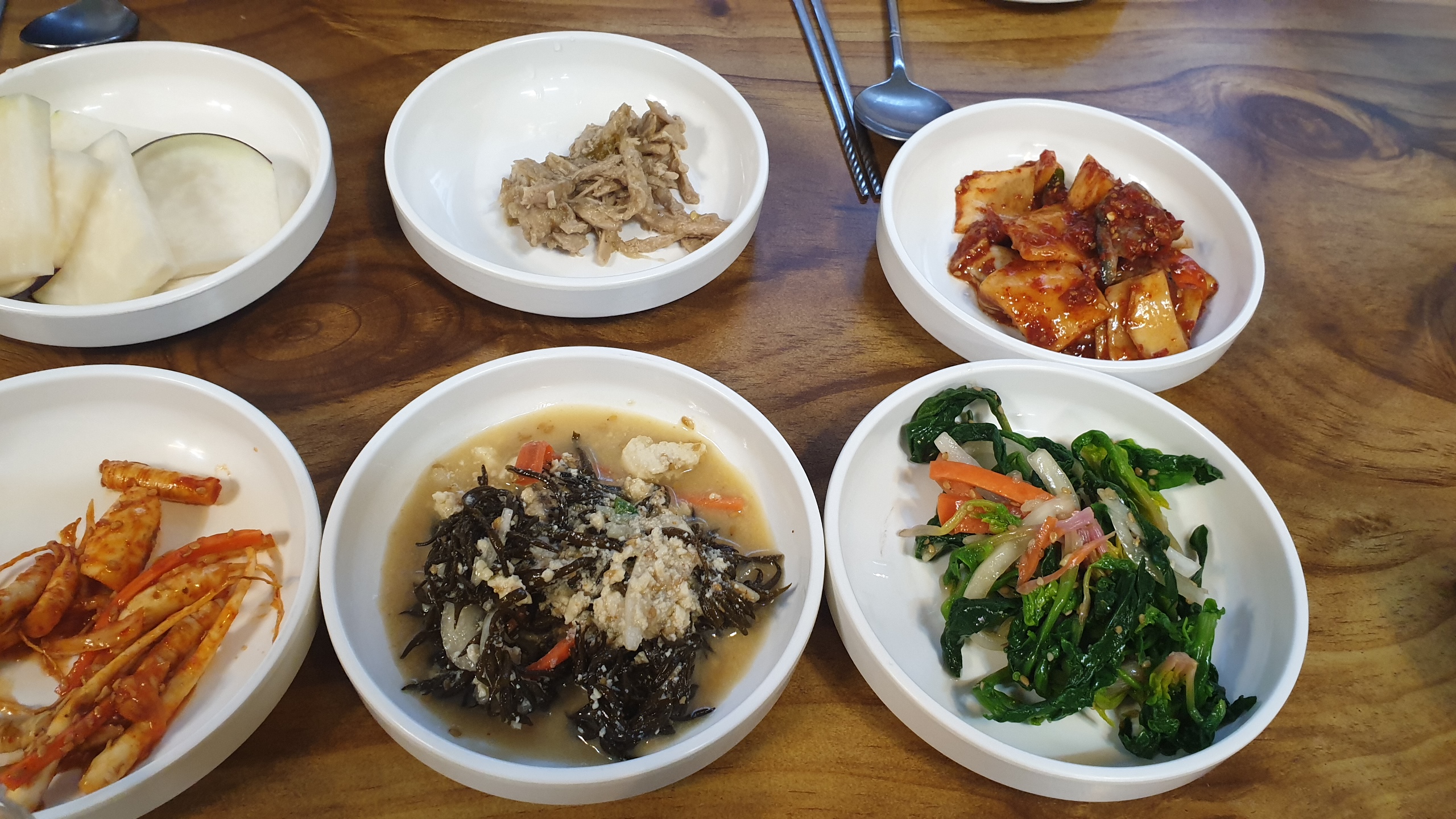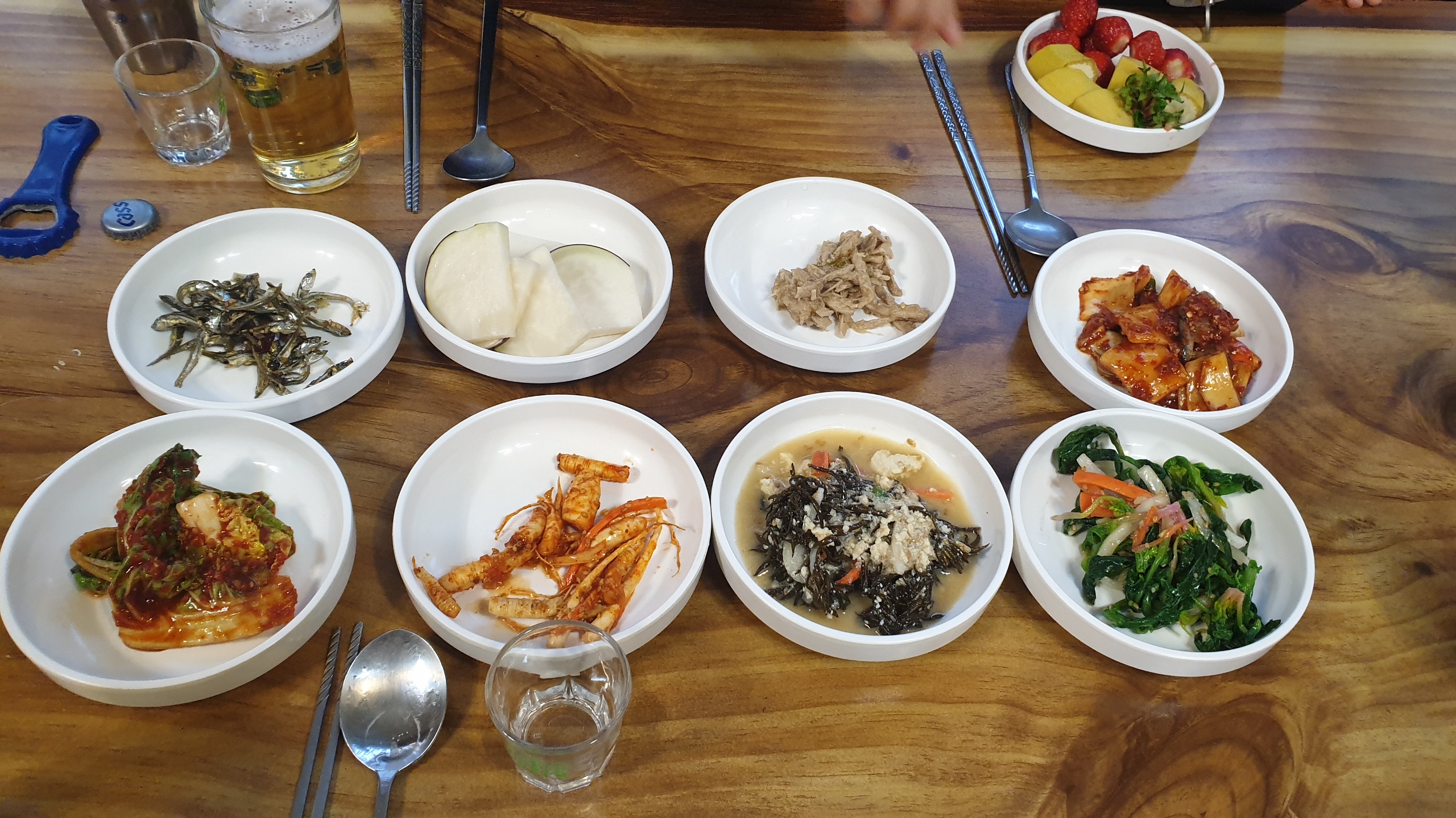 이게 뭐지? 싶은 반찬에서부터 익숙한 나물들, 그리고 과일?