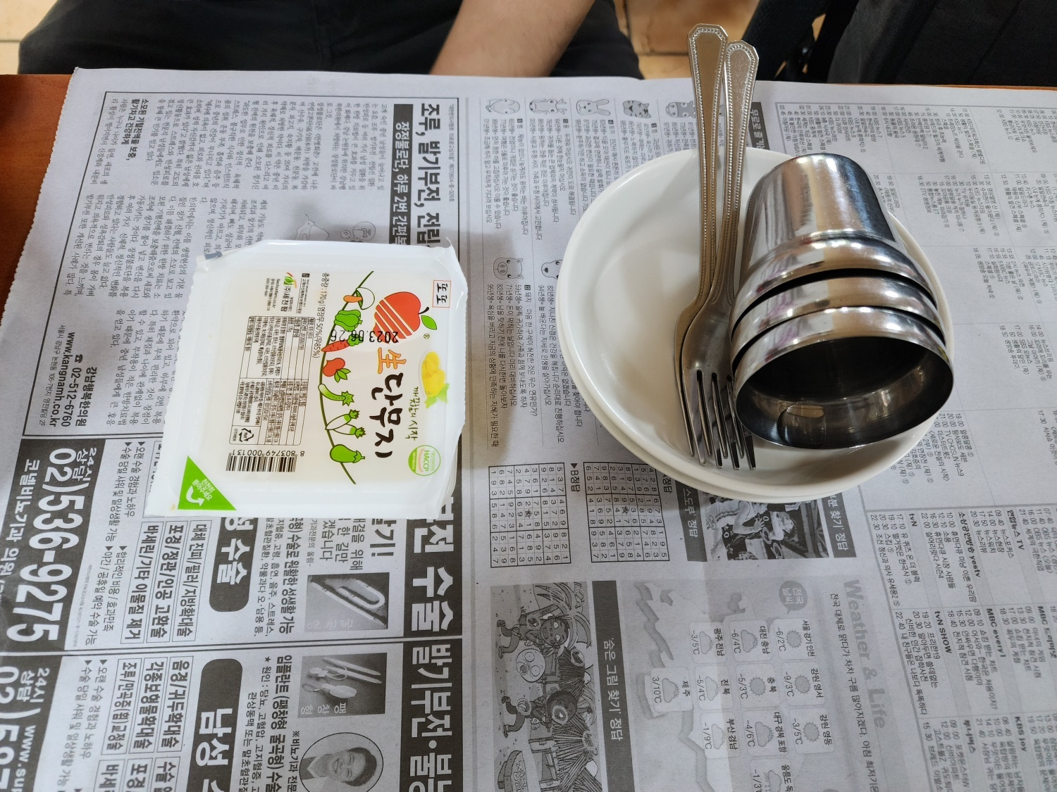 주문을 하자마자 메뉴가 준비되고 일회용이라 조금 더 위생적인 단무지, 그리고 신문지를 깔아준다. 아마도 닭발을 먹는 손님들을 위한 용도인 듯하다.