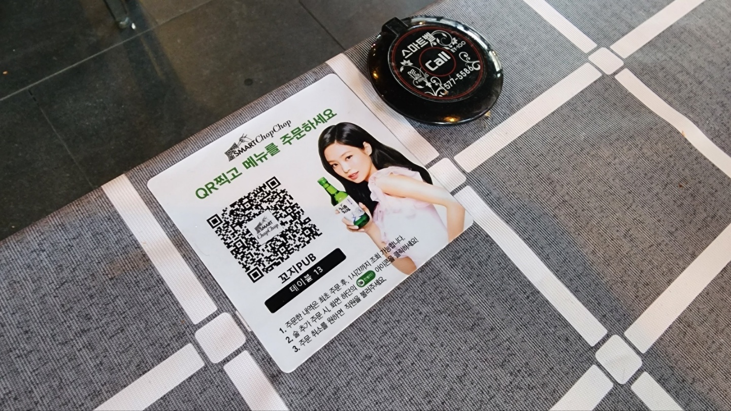 안에 들어가니 가게에 숯불향이 그윽하게 깔려 있다. 자리를 잡고 메뉴판을 찾는데, 주문은 큐알을 통해 하면 된다고 알려준다.
