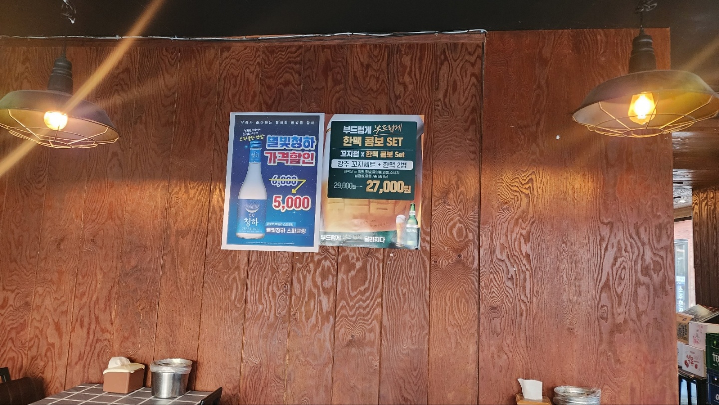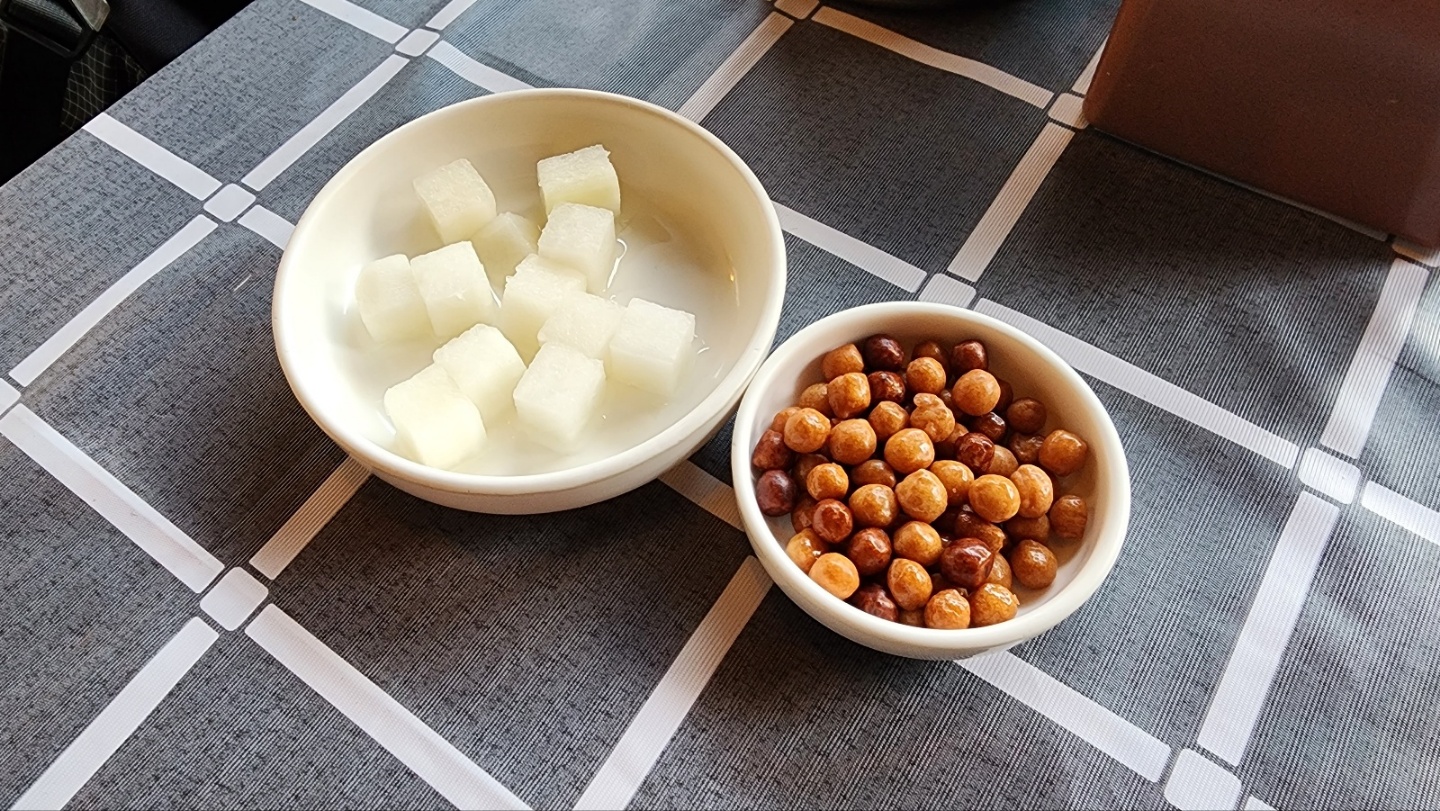 그런데 핸드폰 배터리가 간당간당한 상태. 충전이 가능한지 여쭤보니 벽돌같이 생긴 보조 배터리를 내어주고, 기본 안주로는 깐돌이와 치킨무가 같이 나온다.