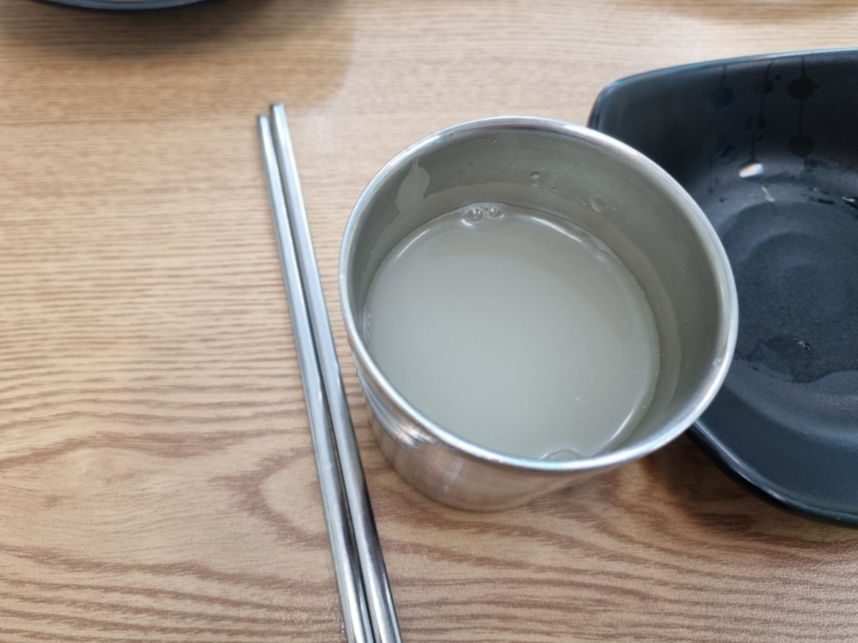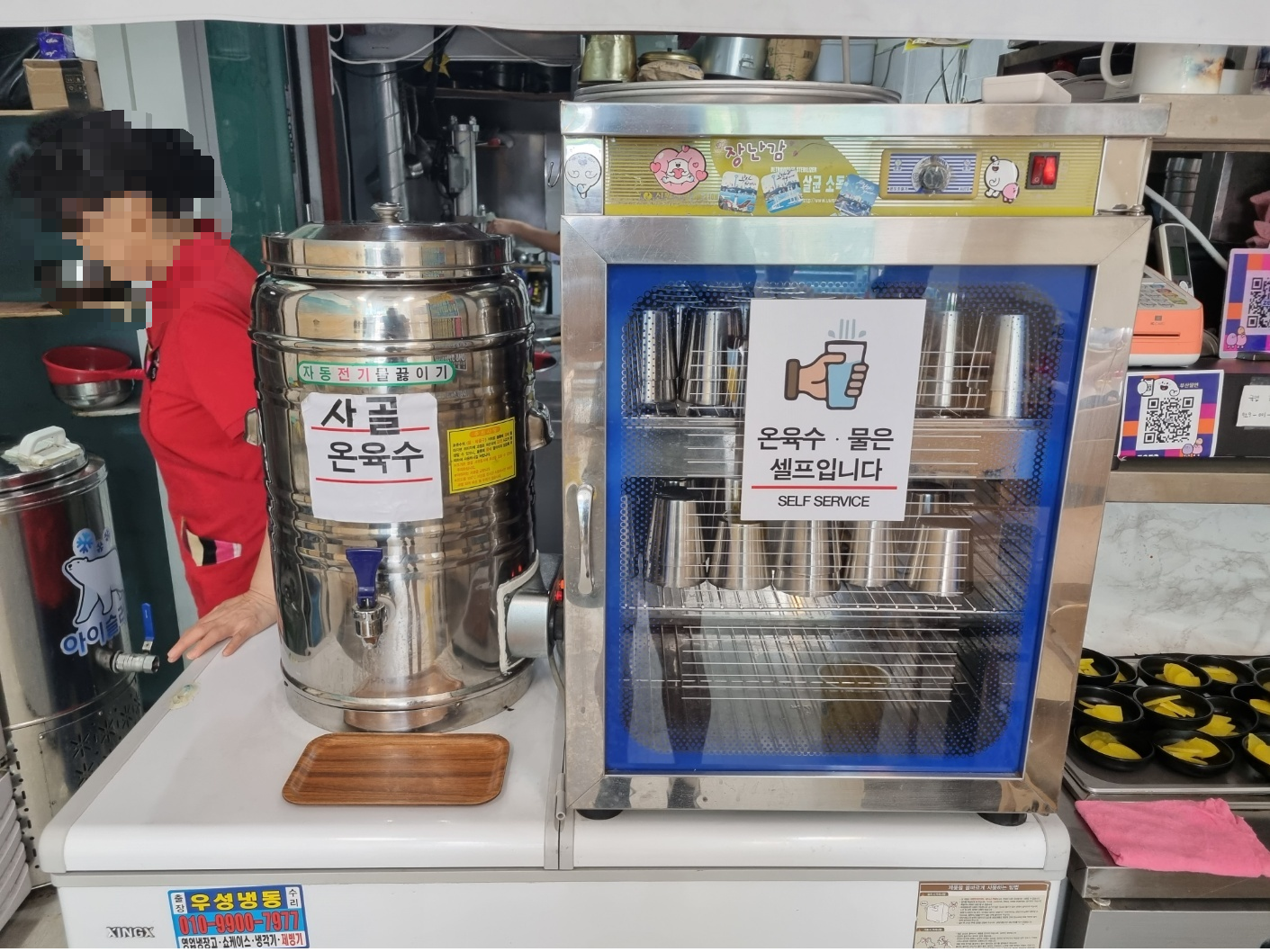 온육수와 물은 셀프인데, 단무지와 무절임은 가져다주는 형식이다. 면이 삶아지는 동안 온육수부터 가져와 맛을 본다. 냉면집처럼 밀면 전문점도, 온육수 맛을 보면 그 집 음식 맛을 대충 가늠할 수 있기 때문이다.