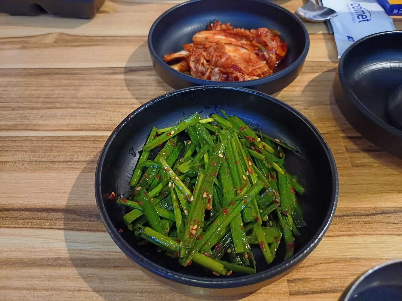 새우젓과 쌈장은 사람당 하나씩 주고, 부추, 겉절이, 상추, 무쌈, 마늘이 기본 상차림이다.