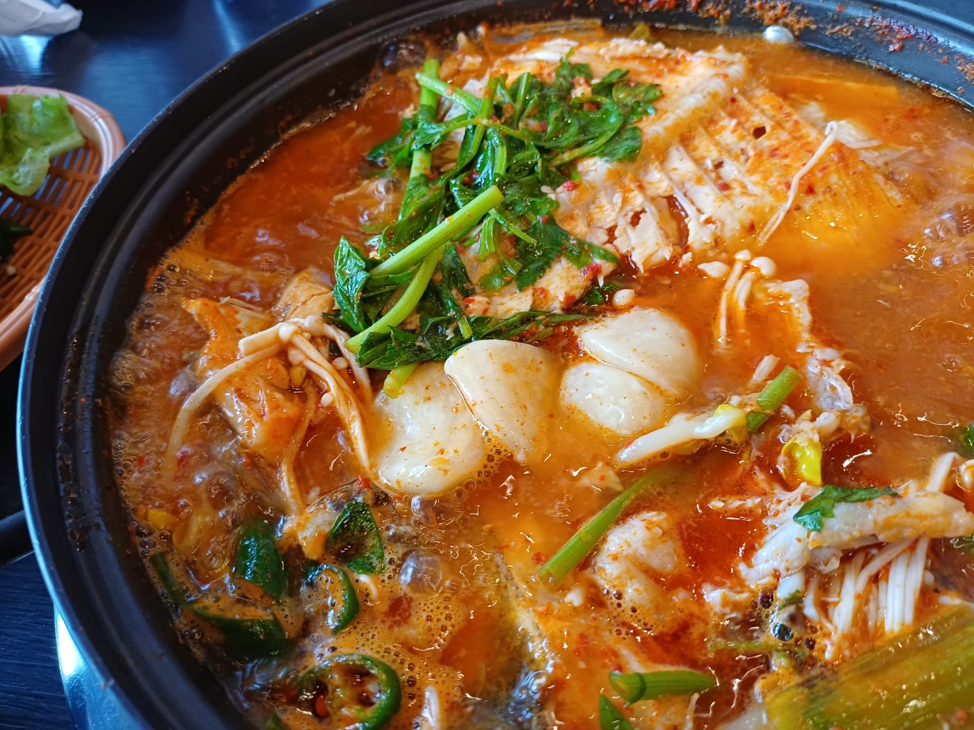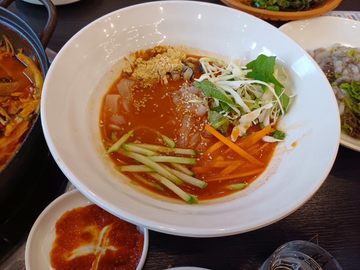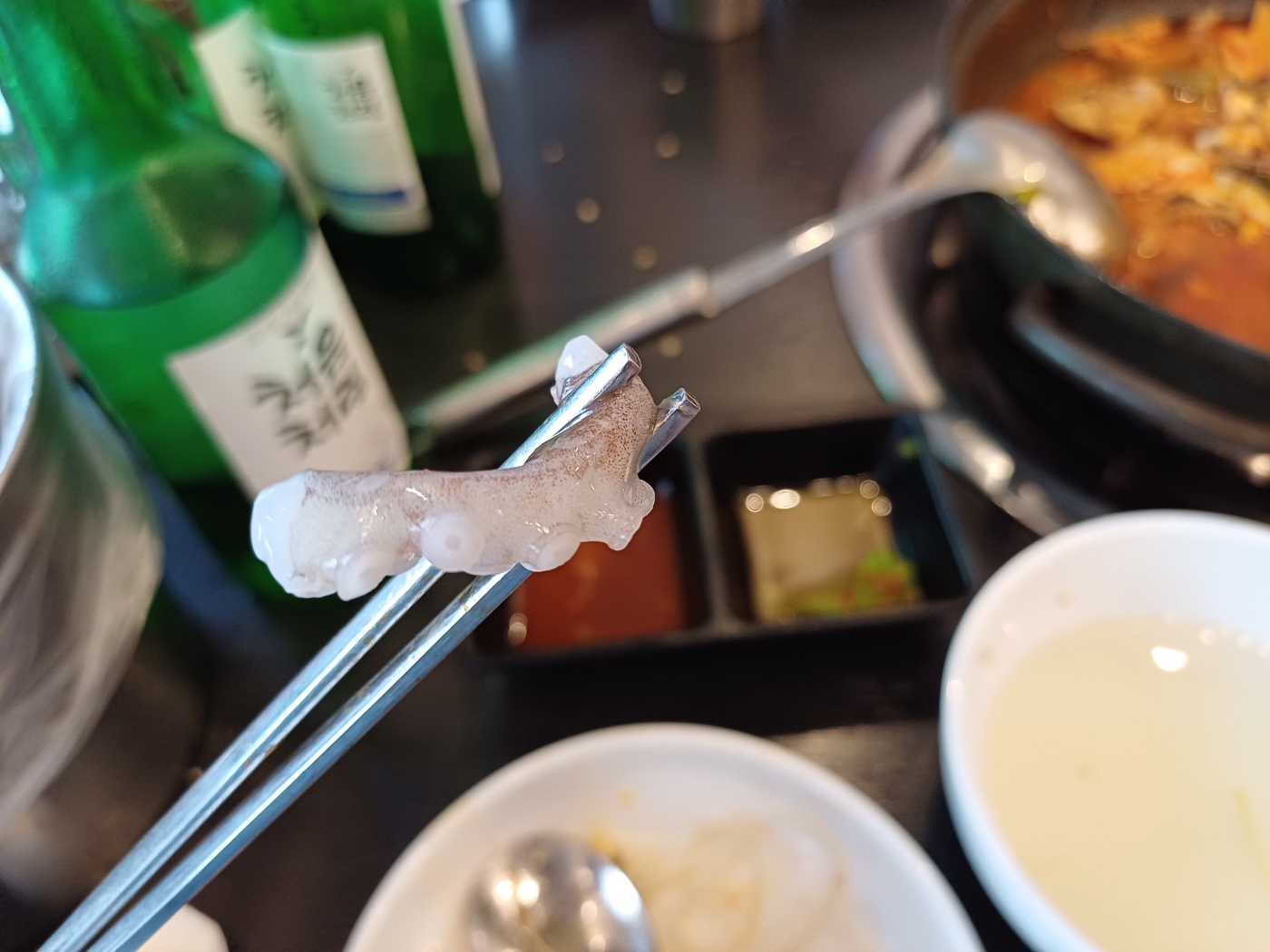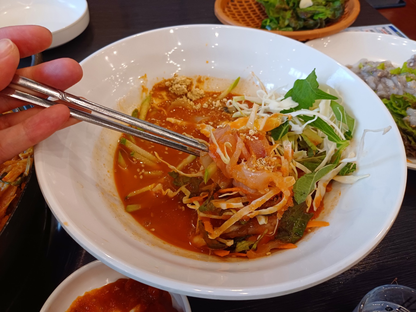 두 번째로 서더리탕과 산 낙지를 주문하니, 서비스로 물회까지 제공된다. 5천 원짜리 서더리탕이지만 수제비도 들어 있고 서더리에 붙은 살이 꽤 두툼하다.