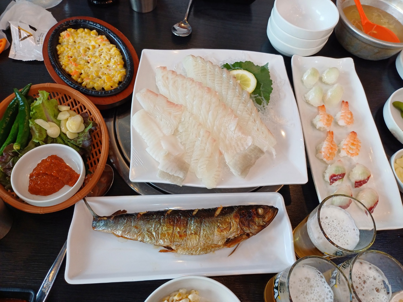 콘치즈와 마카로니는 말해 뭐하나. 이것만으로도 소주 한병각이다. 고기못지않은 비싼 몸값을 자랑하는 쌈채류도 무한제공이고 뒤이어 나오는 초밥과 광어도 훌륭하다.