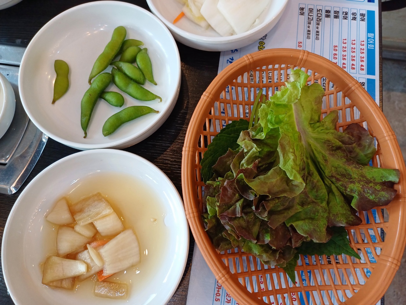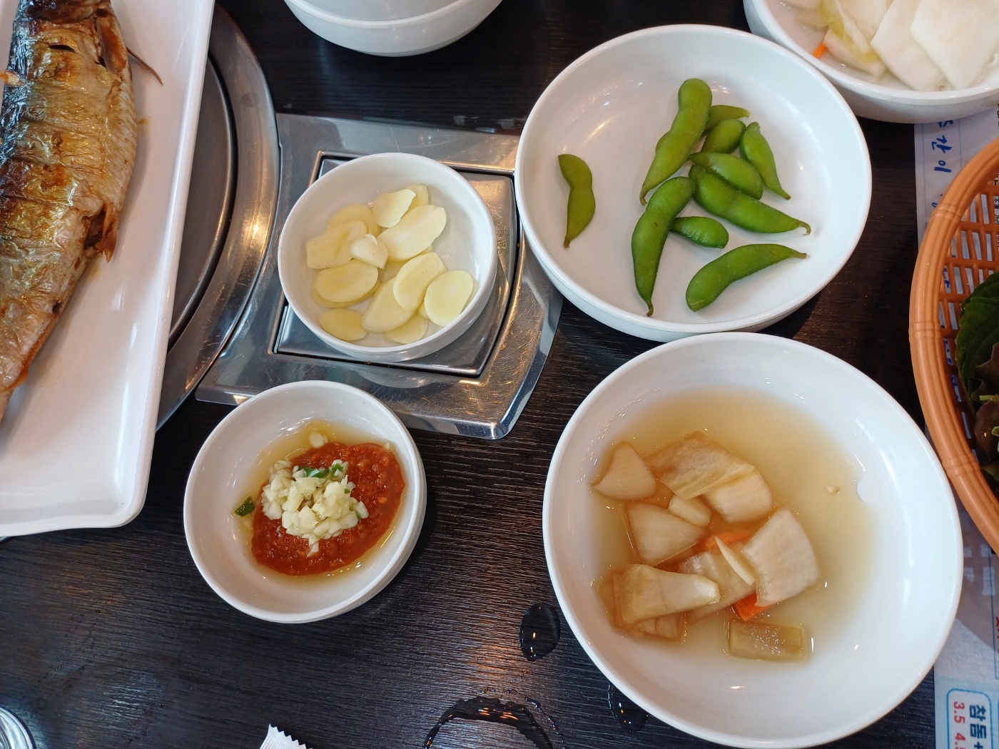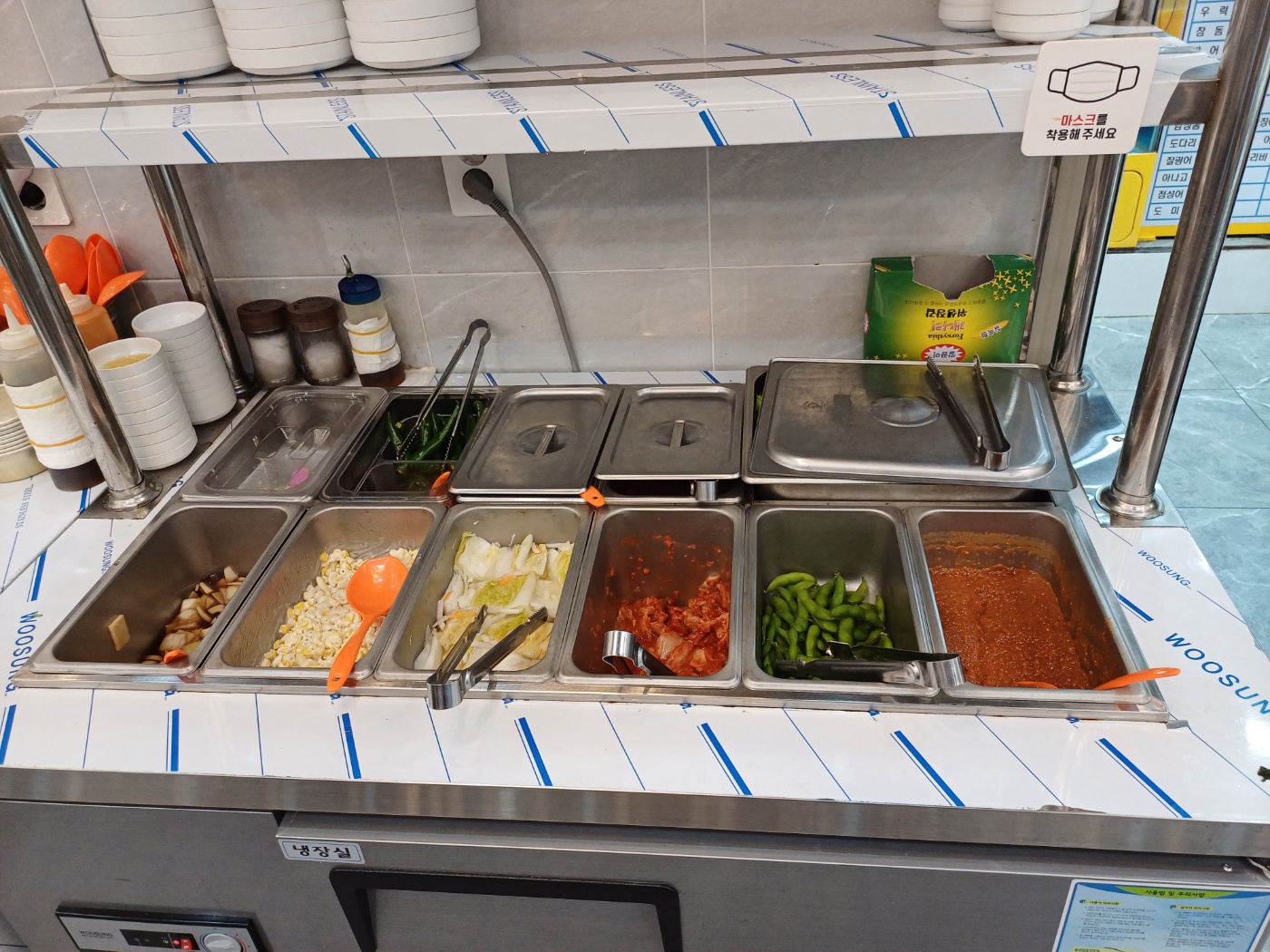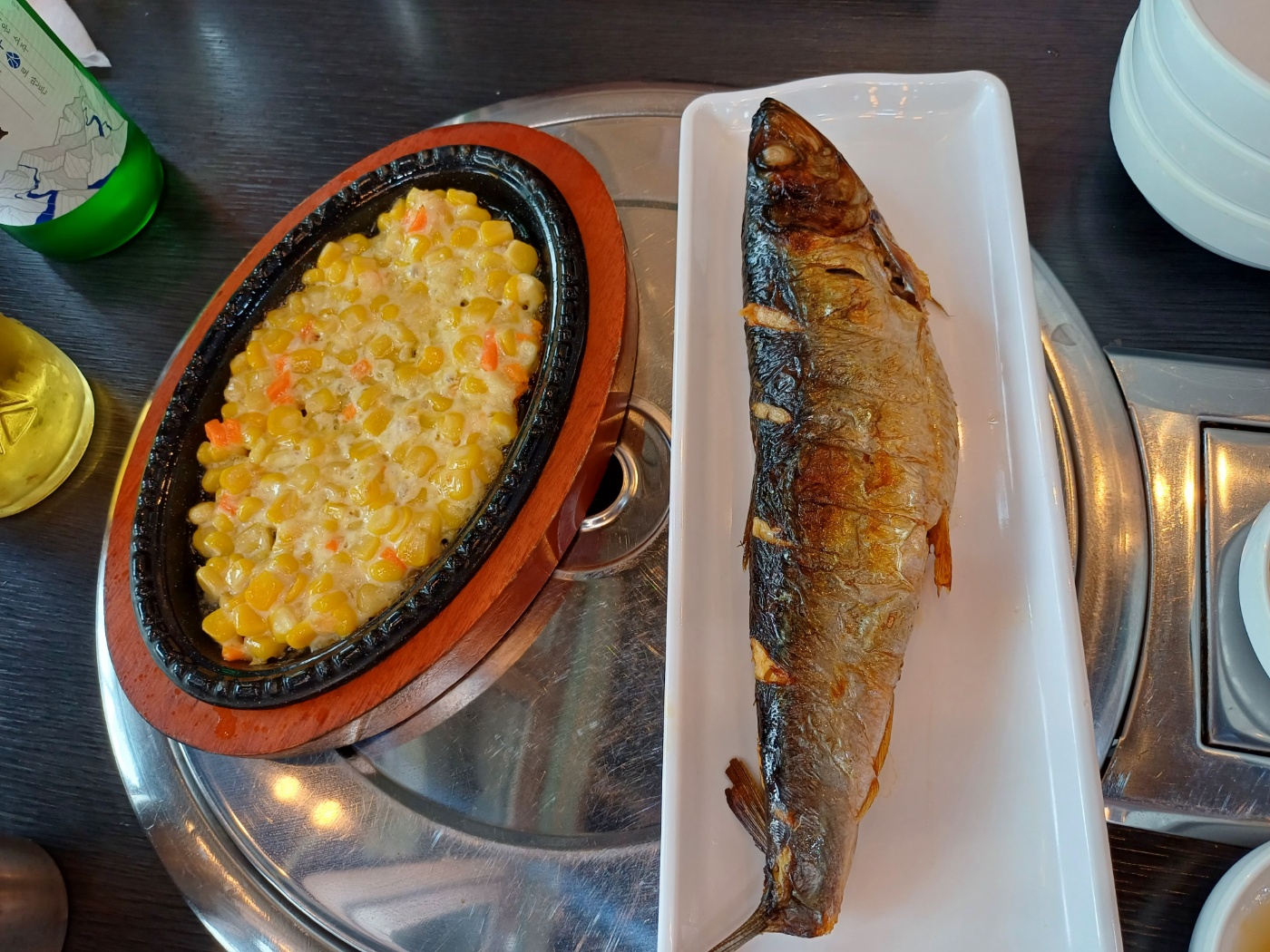 이어 기본 상차림이 제공되는데, 가격이 저렴한 것에 비해 상당히 알차다. 물론 1인당 상차림비가 천원씩 있긴 하지만, 부족한 반찬은 셀프바에서 마음껏 가져다 먹을 수 있고 콘치즈와 생선구이가 나온 것만으로도 가치가 충분하다.