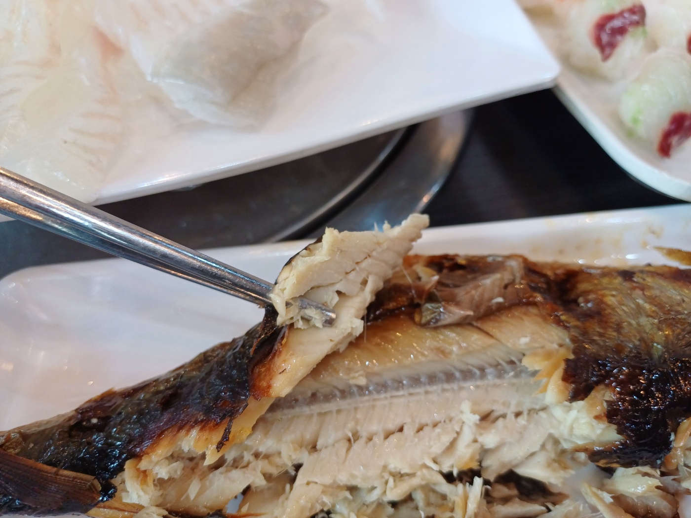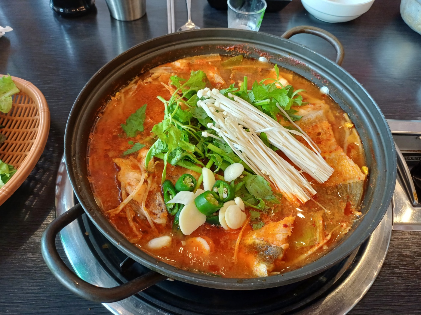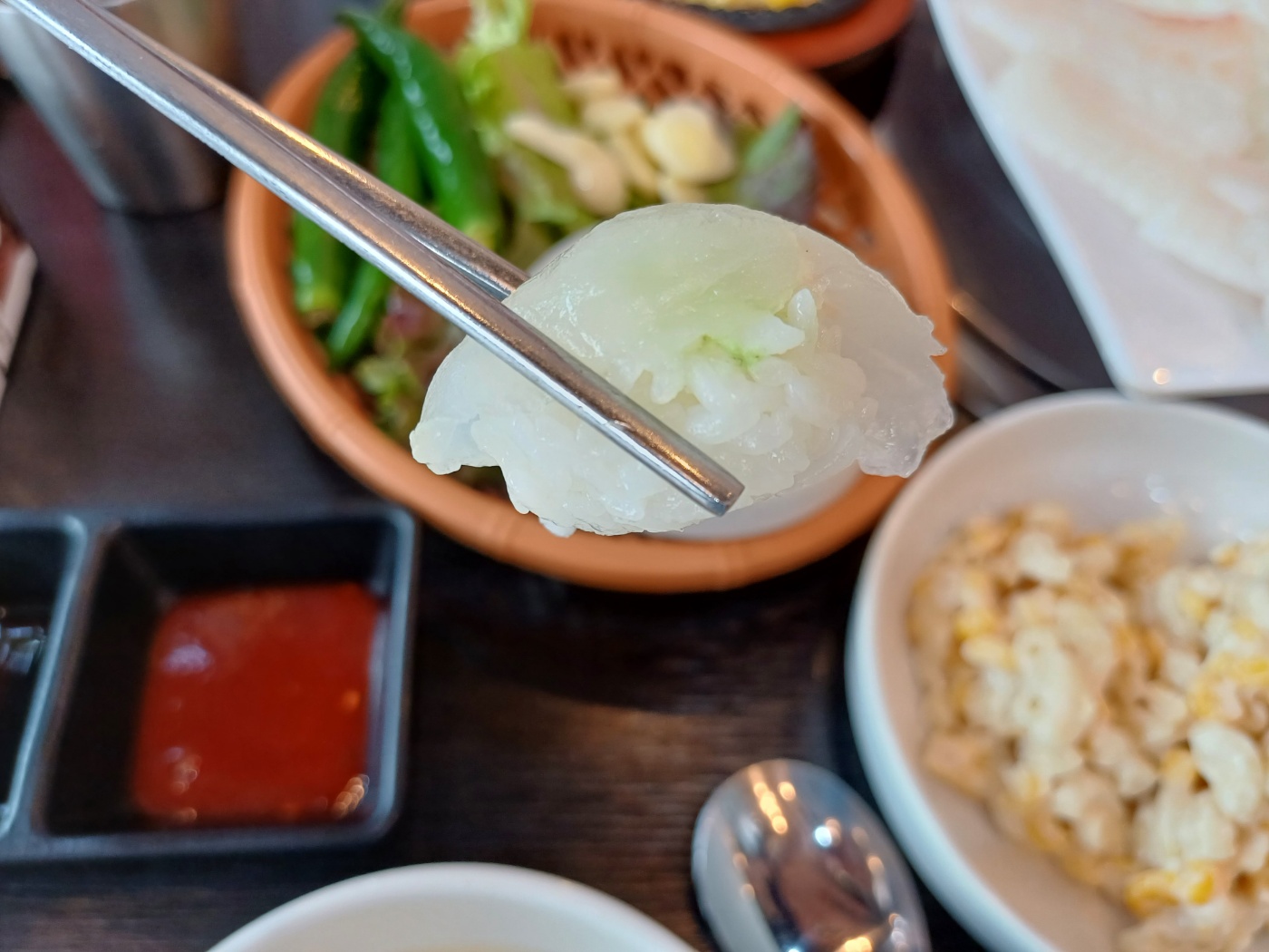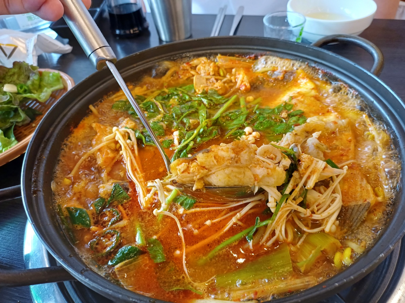 이어 기본 상차림이 제공되는데, 가격이 저렴한 것에 비해 상당히 알차다. 물론 1인당 상차림비가 천원씩 있긴 하지만, 부족한 반찬은 셀프바에서 마음껏 가져다 먹을 수 있고 콘치즈와 생선구이가 나온 것만으로도 가치가 충분하다.