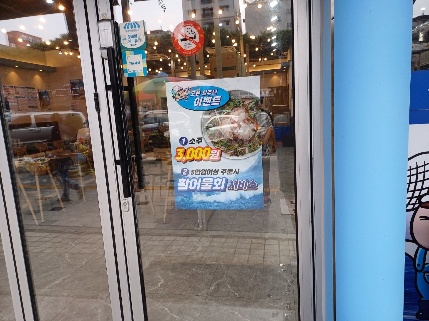 전 지점은 아니고 남한산성점만 개업 1주년 기념으로, 소주 3천원과 5만 원 이상 주문 시 물회 서비스가 진행 중이란다.