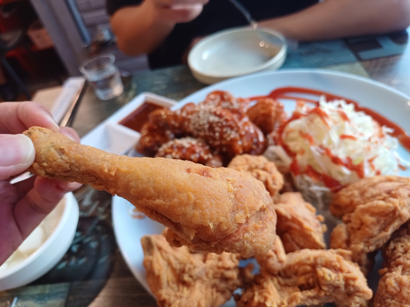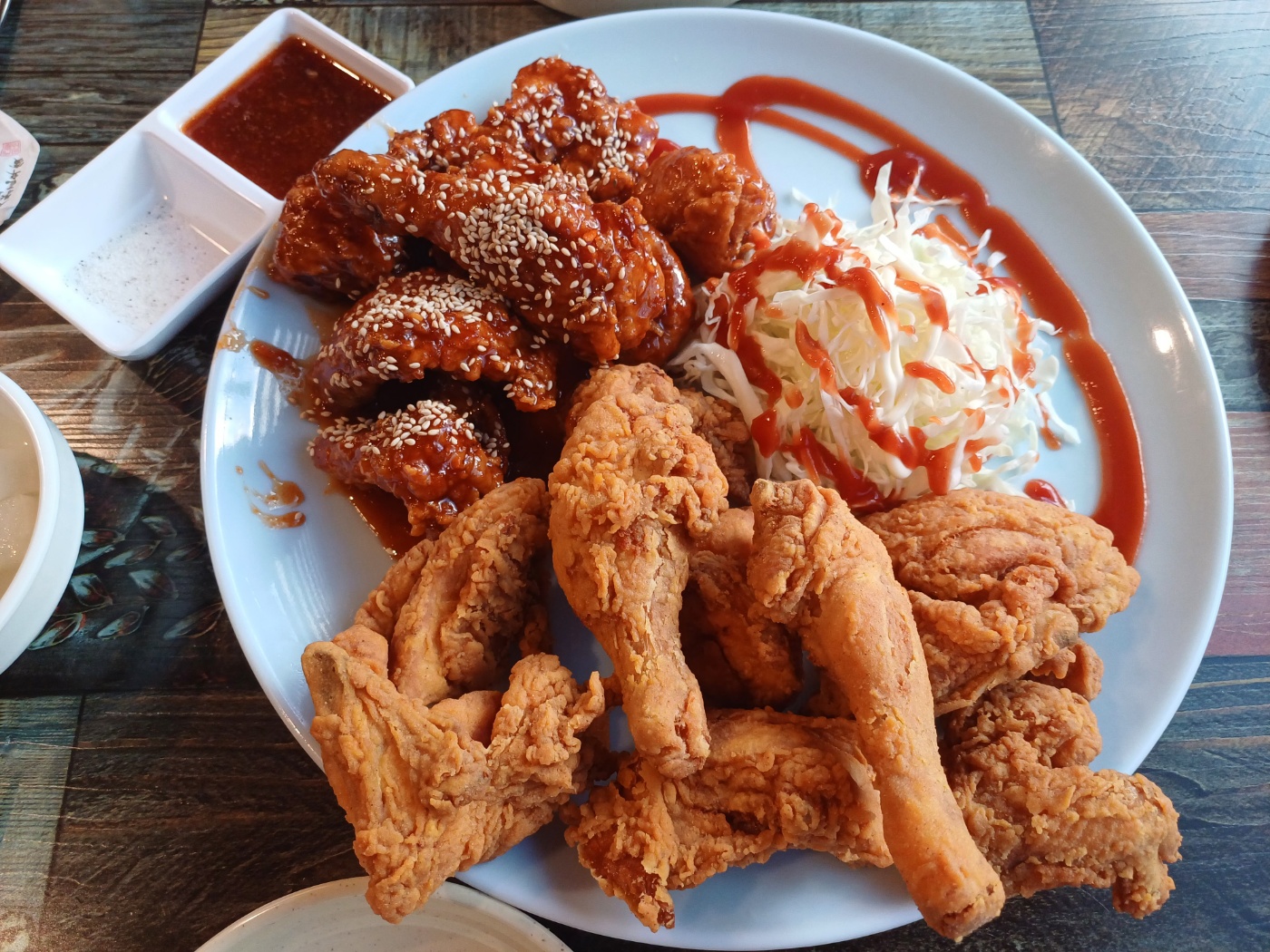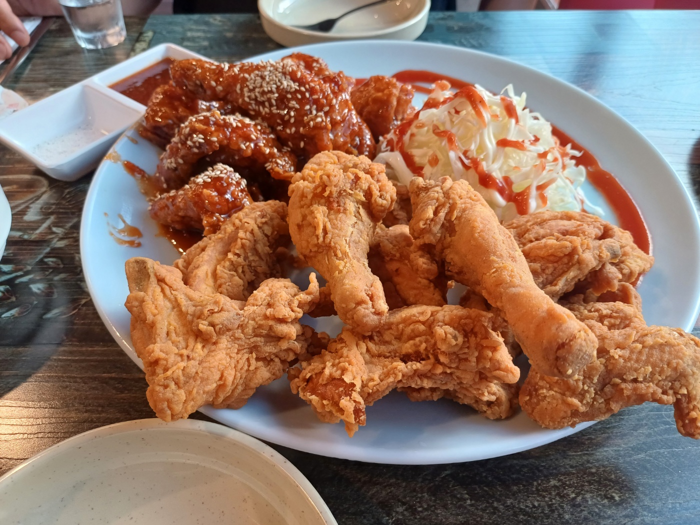 이렇게만 해도 어디가서 빠지지 않을 구성인데, 자세히 보면 닭이 한 마리가 아니다. 닭다리가 무려 3개가 나온다. 큼직한 조각이 14~5개 정도니 한 마리 반을 튀겨 주시는 듯.