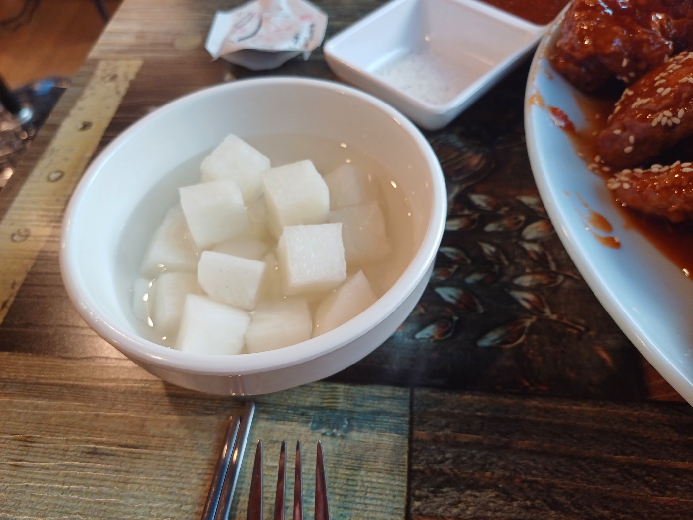 그리고 옛날 치킨의 필수품인 치킨무와 채 썬 양배추가 필수로 나오고, 반반을 시켰음에도 양념과 소금을 듬뿍 담아 따로 또 내어준다.