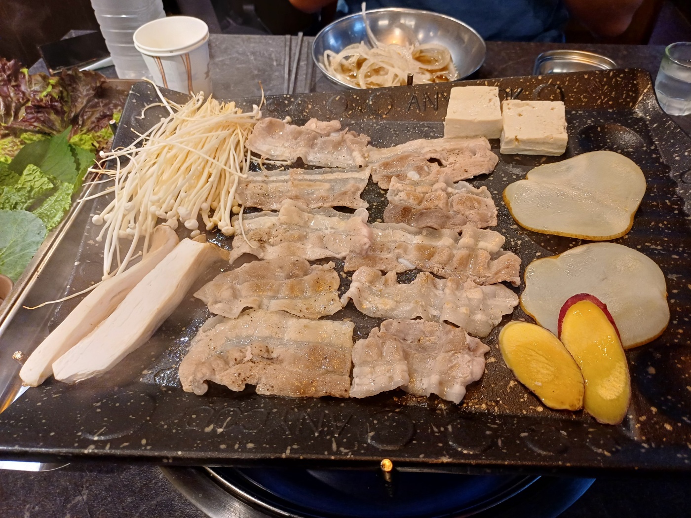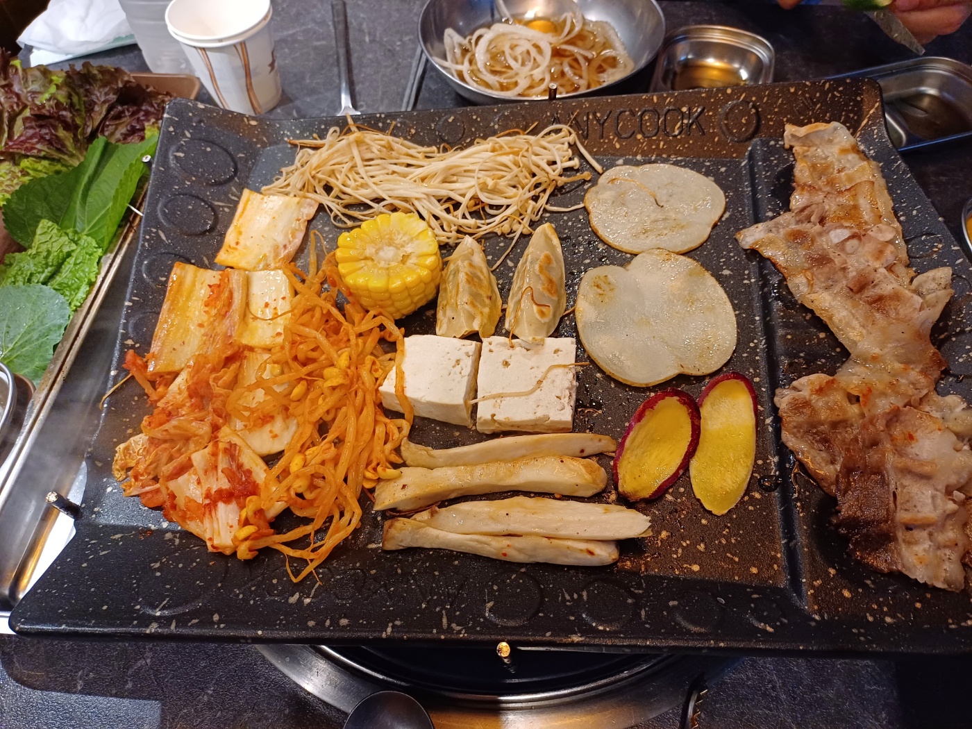 대패삼겹 3인분을 주문하고, 바로 셀프바로 뛰어간다. 고기보다 비싸다는 야채가 싱싱함을 뽐내며 줄 지어있고 감자, 고구마, 김치, 콩나물 무침, 옥수수, 떡같이 구울 수 있는 부재료도 무지 많다.