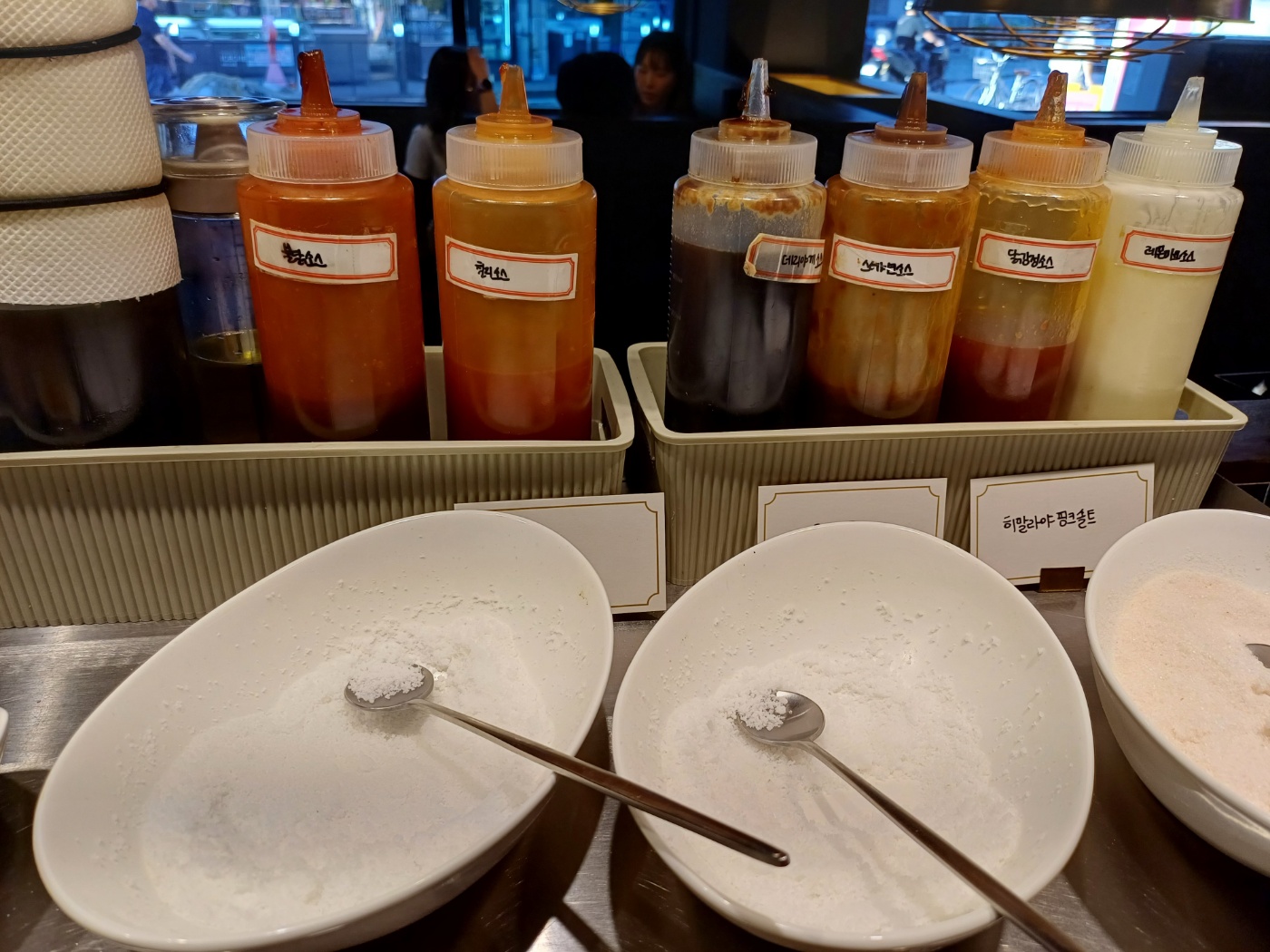 심지어 샐러드와 각종 드레싱까지 있어서 좋고 고기전용 소스들이 소금부터 후추, 고추냉이 등등 아무튼 고기와 함께 먹을 수 있는 모든 종류를 다 가져다 놓은 모양새다.