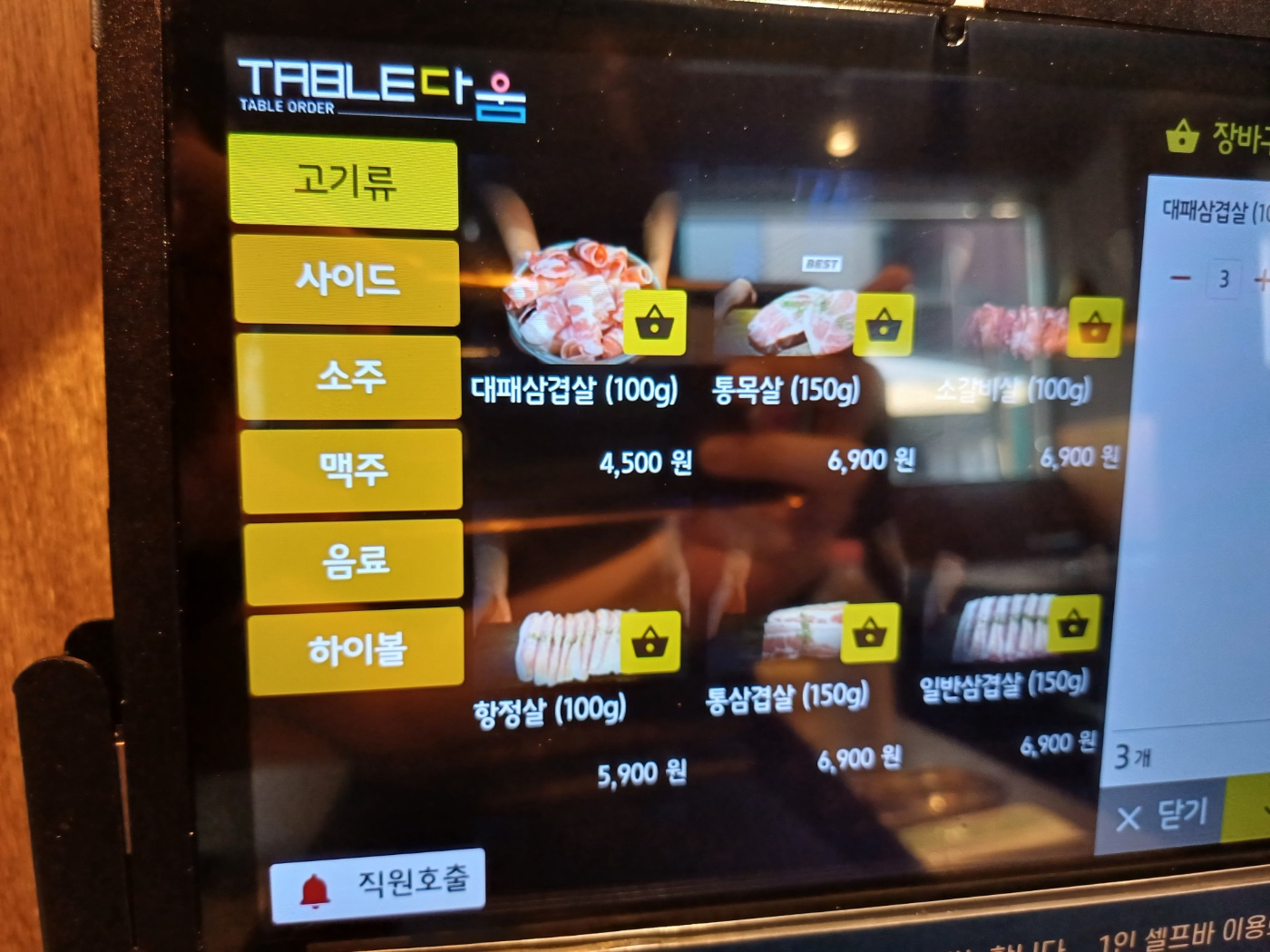 가격은 가장 기본이 되는 대패삼겹이 1인분 기준 100그람에 4,500원. 인당 셀프바 이용료가 1,500원씩 부과되고 첫 주문 시에는 300그람 이상을 주문해야 한다.