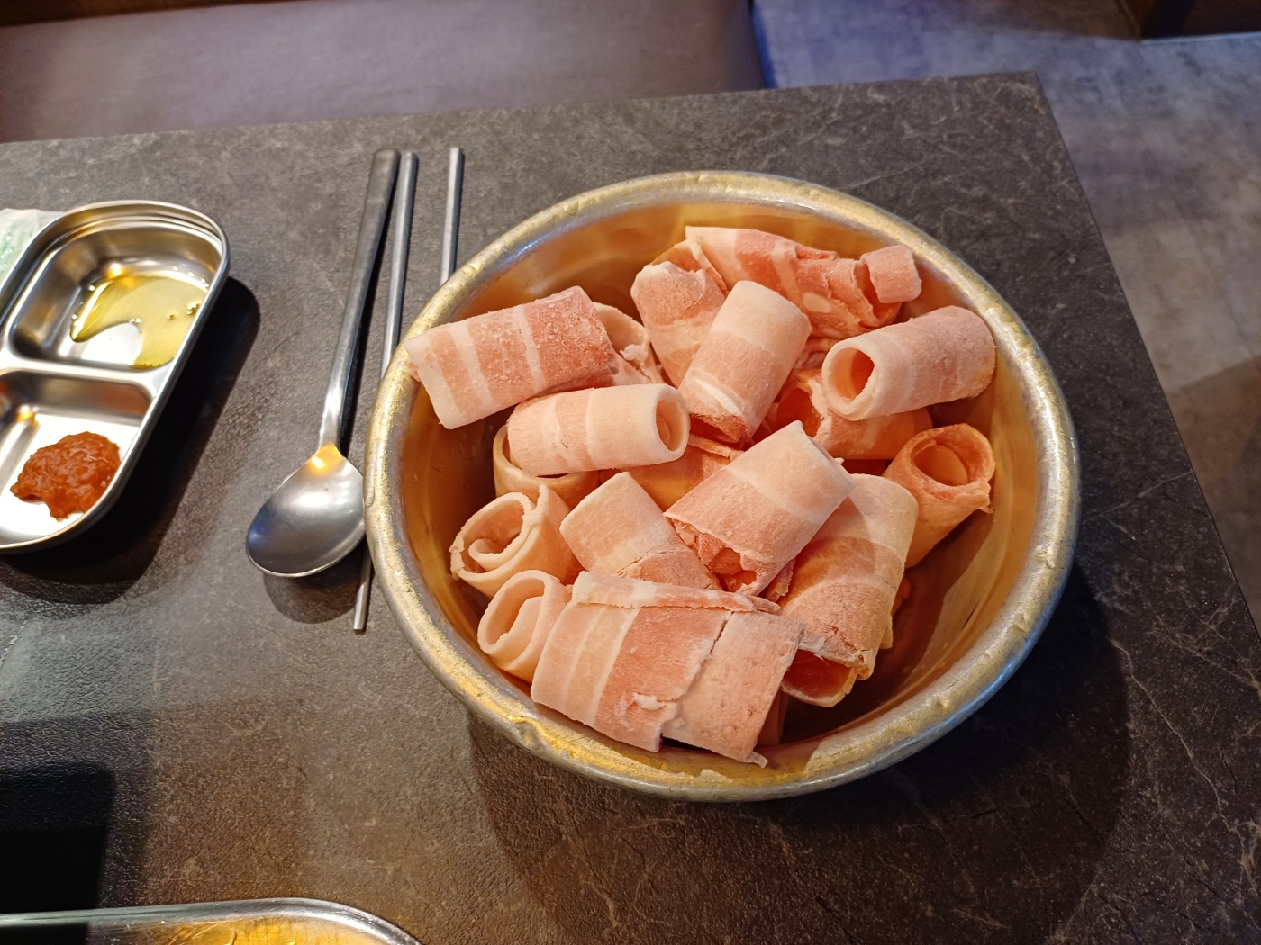 남기면 안 되니 좋아하는 재료들 위주로 골라 담고, 자리로 돌아오니 고기가 도착해 있다.