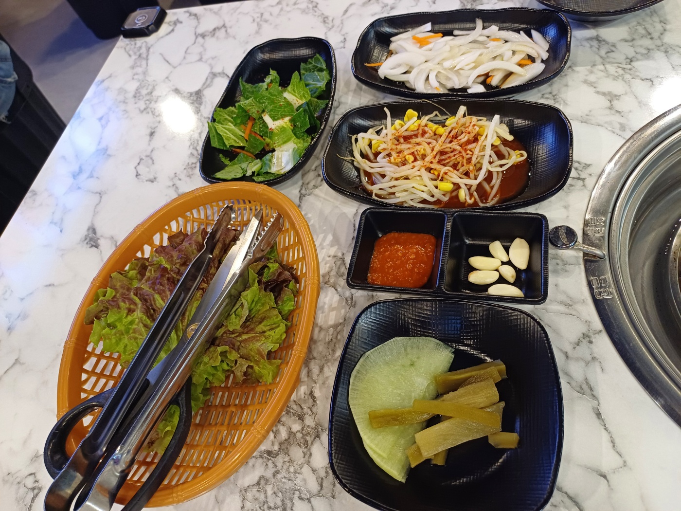돼지갈비 세트와 모듬 중 고민을 하다, 삼겹, 항정, 목살이 함께 나오는 작은 돼지 한 마리로 주문을 하고, 없으면 아쉬운 된장찌개를 추가했다.