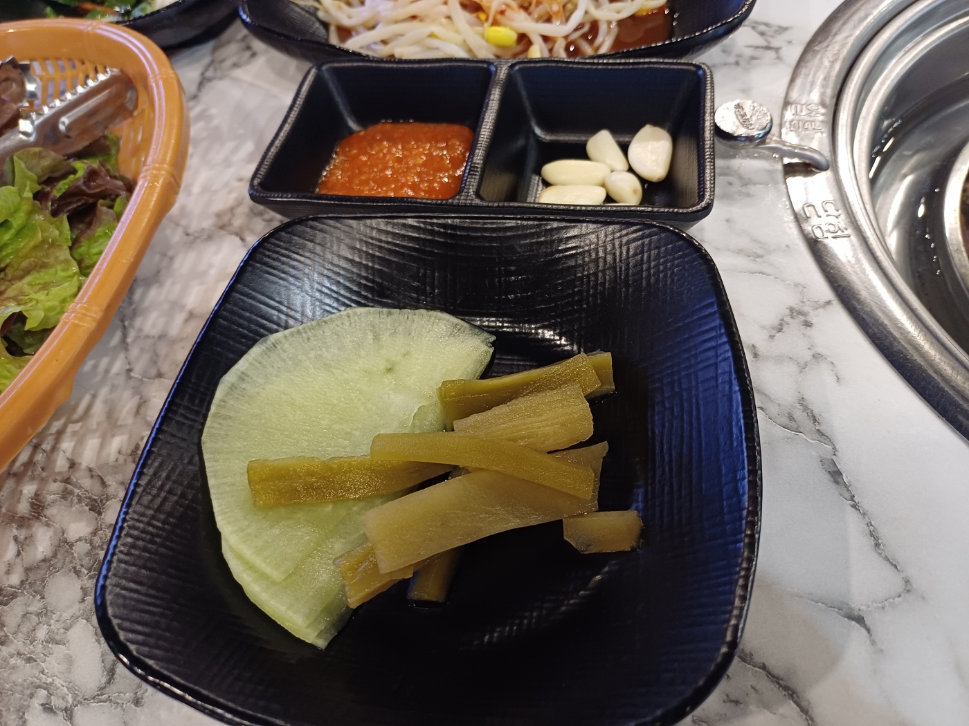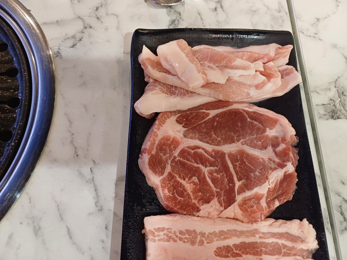 삼겹살을 시작으로 목살, 항정살 순으로 구워 먹는데 개 중 항정살이 가장 맛이 좋다. 목살과 삼겹살은 보통의 맛인데 다른 가게에 비해 육질이 유독 뻑뻑하다.