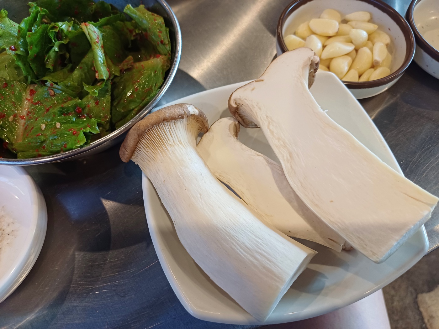 기본 밑반찬은 상추 겉절이와 백김치, 양배추 샐러드, 김치와 마늘, 버섯을 구워 먹을 수 있게 준비해 준다. 주류는 자리마다 잔이 놓여 있어 술장고에서 셀프로 가져와 먹으면 된다.