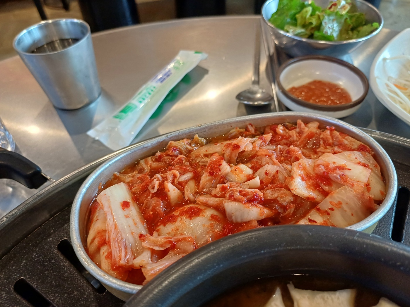 정중앙에 자리 잡은 찌개가 끓으면 국물로 속을 달래주고, 익은 고기들부터 먹으면 된다. 요새 몸값 귀한 쌈에 먹어도 맛이 좋고 구운 김치 위에 얹어 먹어도 꿀맛이다.