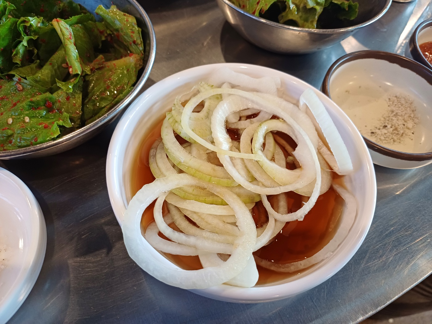 여기 까지라면 절대 반찬이 잘 나오는 수준이 아니지만, 셀프바에 가면 쌈채소와 양파절임, 고추, 김치등을 가져다 먹을 수 있고 된장찌개가 무한으로 제공된다.