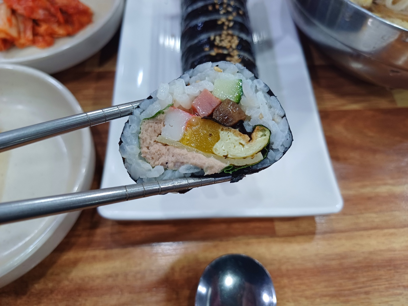의외로 참치김밥이 너무 맛있었는데, 재료가 균일하게 썰려 있어 입에서 풀어질 때 각각의 맛이 다양하게 나서 더욱 좋다. 참치와 밥 나머지 재료들의 비율이 조화로울 때 날 수 있는 맛이랄까.