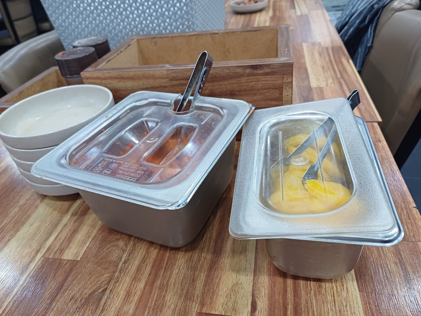 기본찬인 김치와 단무지는 통으로 가져다 주는데, 먹을 만큼 덜어서 먹으면 된다. 국숫집답게 김치가 무척이나 맛깔스러워 보여 맛을 보니 시원하고 아삭해 좋다.