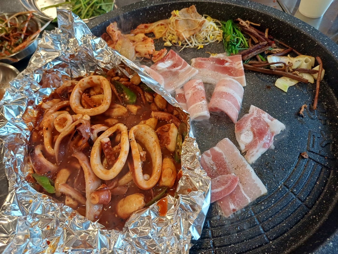 여러 야채와 고기를 올려 굽고 있으면 불오징어도 주방에서 완성돼 나온다.