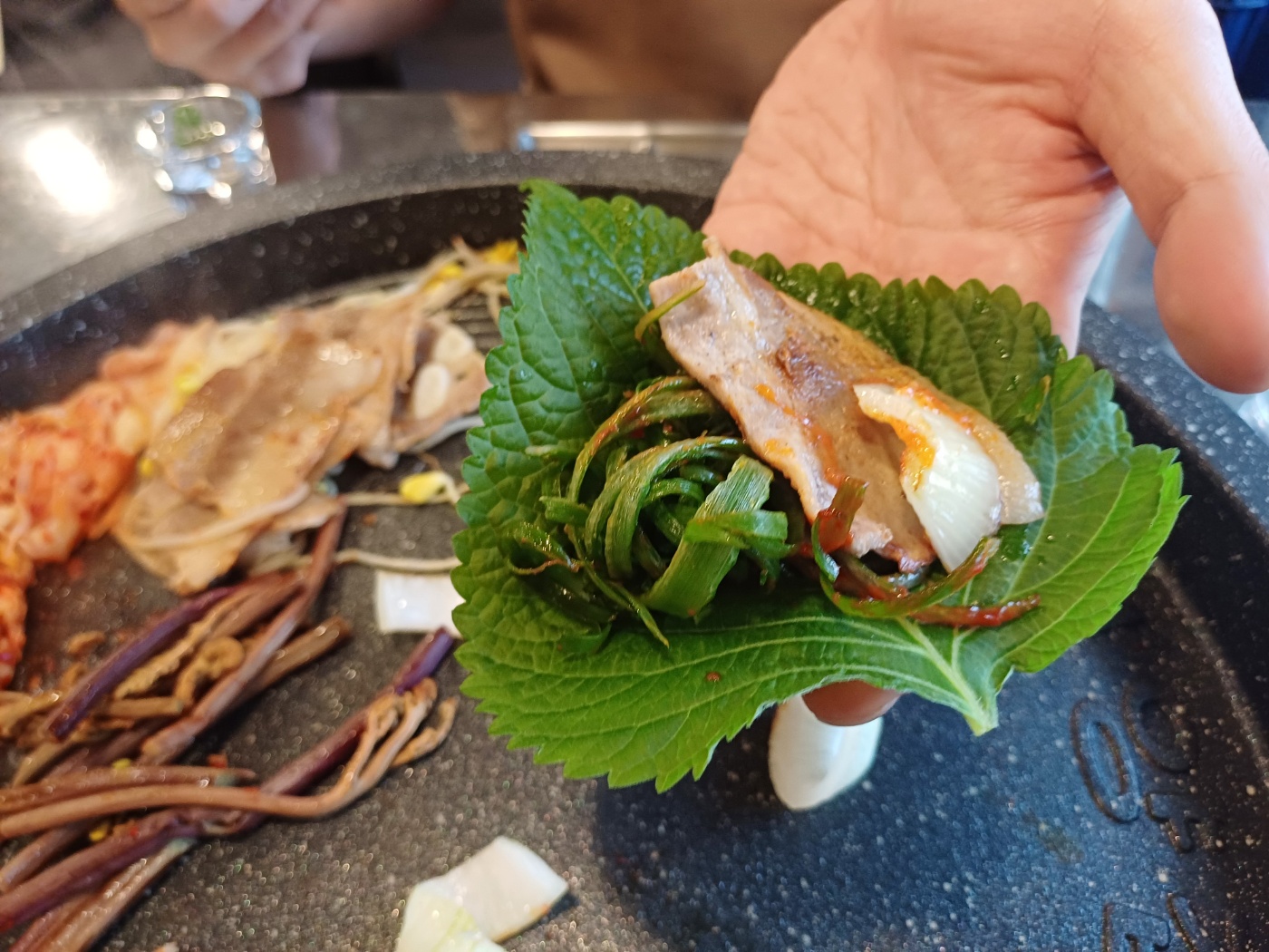 돌판이라 야채를 같이 구울 수 있게끔 반찬 구성이 짜여 있는데, 미나리, 콩나물, 고사리와 양파가 시원시원하게 나왔다.